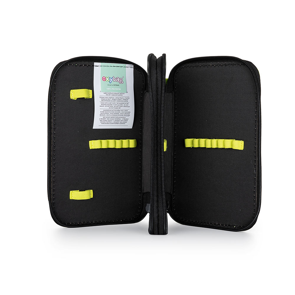 Školní penál dvoupatrový bez náplně. Penál obsahuje 25 gumových poutek pro uložení všech psacích potřeba a drobností potřebných k výuce. Penál má pevný zip s velkými taháčky pro snadnou manipulaci. Jedno patro je opatřeno průhlednou přihrádkou pro týdenní rozvrh.