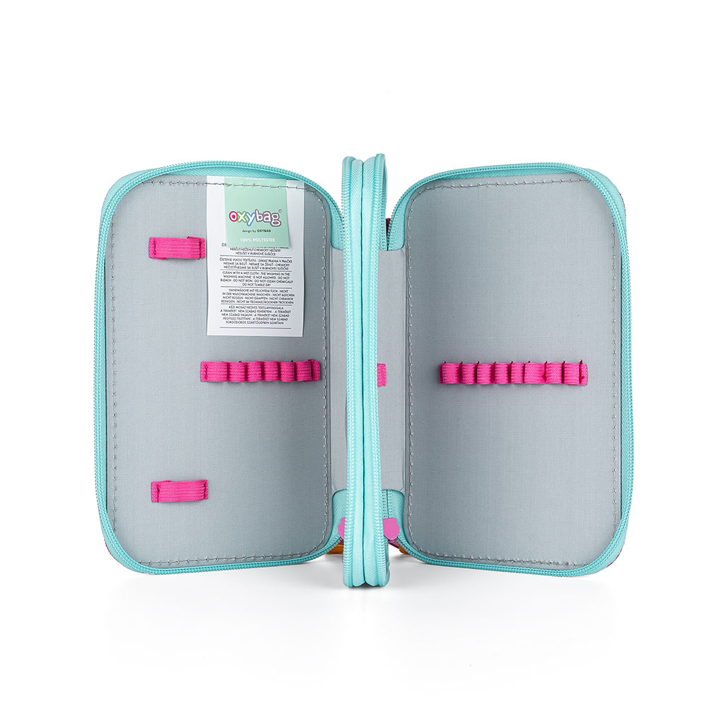 Školní penál dvoupatrový bez náplně. Penál obsahuje 25 gumových poutek pro uložení všech psacích potřeba a drobností potřebných k výuce. Penál má pevný zip s velkými taháčky pro snadnou manipulaci. Jedno patro je opatřeno průhlednou přihrádkou pro týdenní rozvrh.