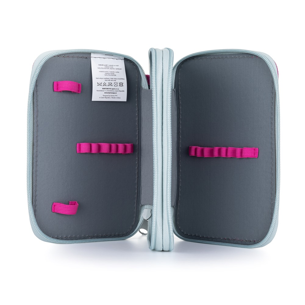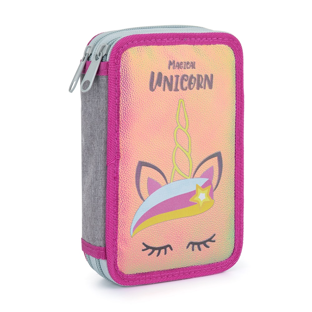 Školní penál dvoupatrový bez náplně s motivem jednorožce. Penál obsahuje 25 gumových poutek pro uložení všech psacích potřeb a drobností potřebných k výuce. Penál má pevný zip s velkými taháčky pro snadnou manipulaci. Jedno patro je opatřeno průhlednou přihrádkou pro týdenní rozvrh.