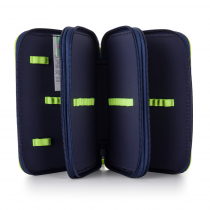 Školní penál třípatrový bez náplně. Penál obsahuje 41 gumových poutek pro uložení všech psacích potřeba a drobností potřebných k výuce. Penál má pevný zip s velkými taháčky pro snadnou manipulaci. Jedno patro je opatřeno průhlednou přihrádkou pro týdenní rozvrh.
