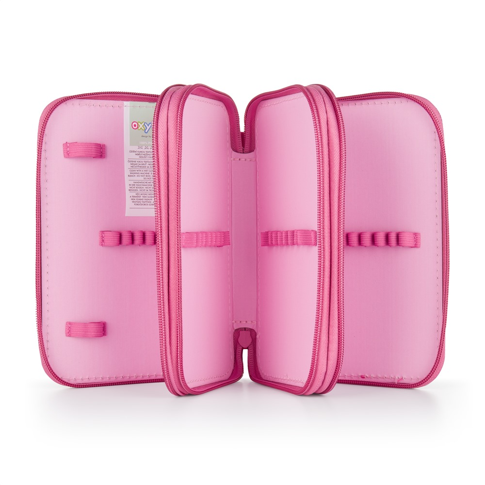 Školní penál třípatrový bez náplně. Penál obsahuje 40 gumových poutek pro uložení všech psacích potřeb a drobností potřebných k výuce. Penál má pevný zip s velkými taháčky pro snadnou manipulaci. Jedno patro je opatřeno průhlednou přihrádkou pro týdenní rozvrh.