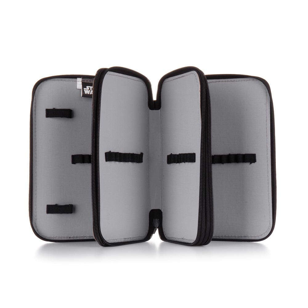 Školní penál třípatrový bez náplně ve Star Wars designu. Penál obsahuje 40 gumových poutek pro uložení všech psacích potřeba a drobností potřebných k výuce. Penál má pevný zip s velkými taháčky pro snadnou manipulaci. Jedno patro je opatřeno průhlednou přihrádkou pro týdenní rozvrh.