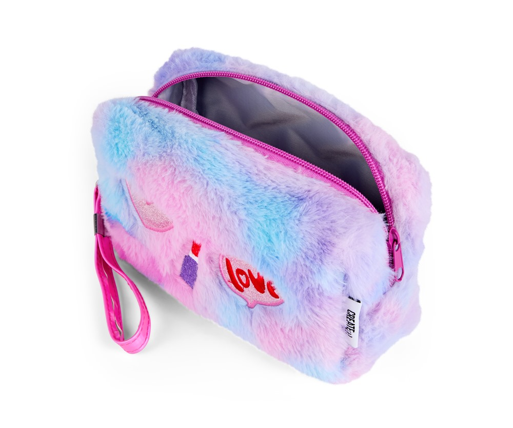 Udrž svůj make-up uspořádaný a zároveň stylový s PLYŠOVOU TAŠTIČKOU NA MAKE-UP od Create it! Tato roztomilá zipová taštička má měkký plyšový povrch v magických duhových barvách a je zdobená veselými motivy: srdíčkem, rtěnkou a ikonou lásky. Je ideální velikosti pro uložení všech oblíbených kosmetických produktů, ať už jsi doma, nebo na cestách.Hravý a zářivý design z ní činí nezbytný doplněk pro mladé nadšenkyně make-upu, které se rády nebojí být odvážné a kreativní. S kosmetickou taštičkou od Create it! budou tvoje kosmetické poklady vždy v bezpečí a stylově uložené.