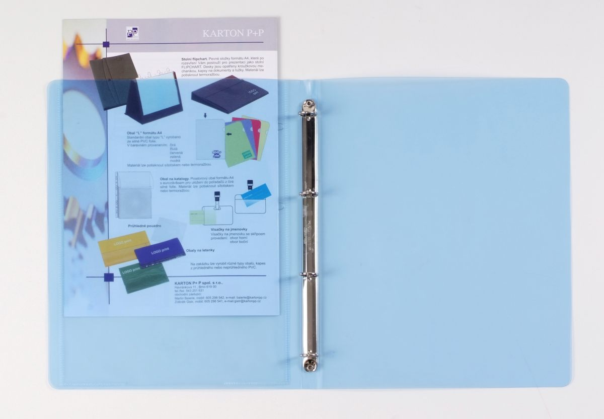 Kroužkový pořadač z extra silného polypropylenu, 4kroužková mechanika, hřbet šířky 2 cm, průhledná přední kapsa pro vložení letáku.