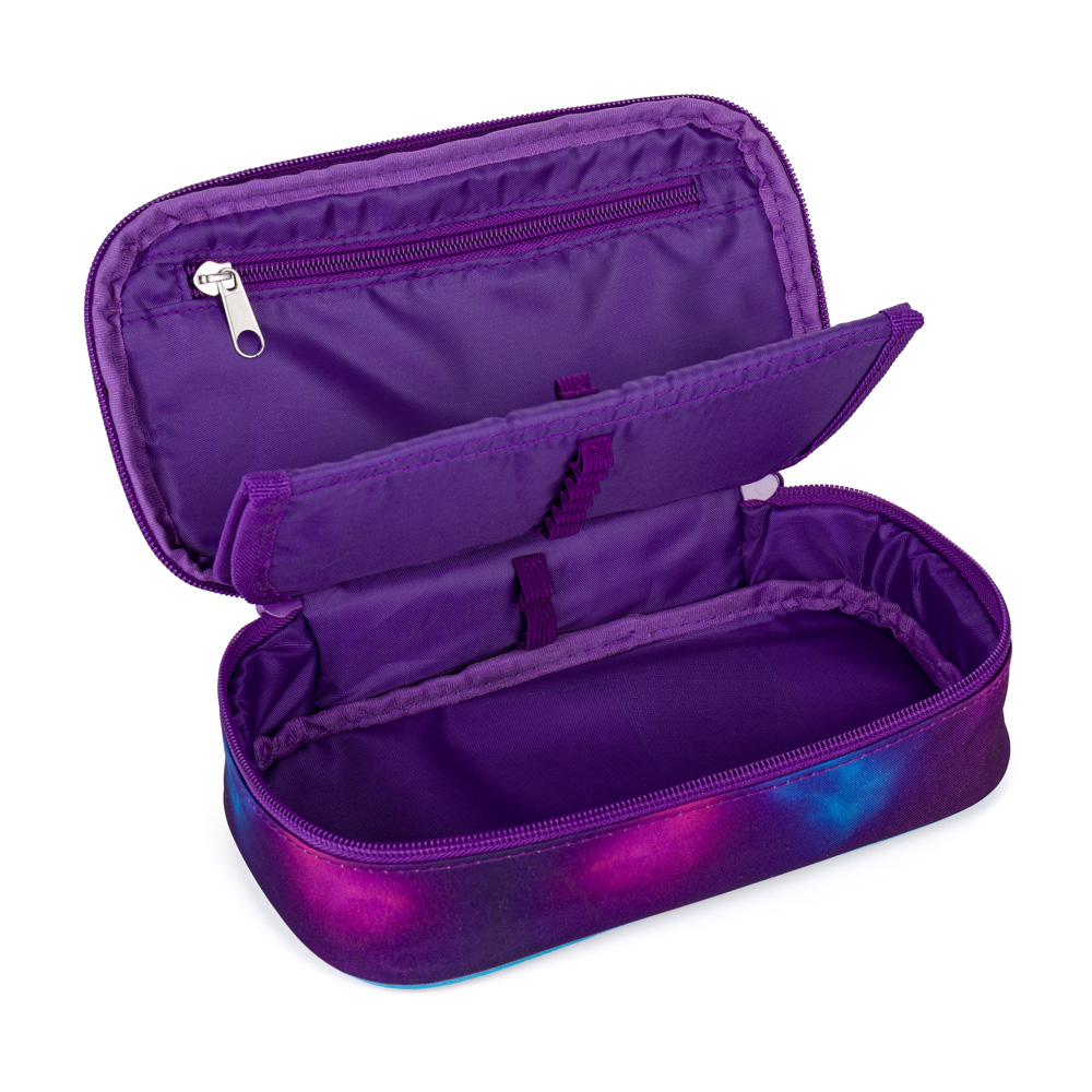 Školní pouzdro je opatřeno pevnými zipy, uzavíratelnou kapsičkou na zip, přihrádkou na pravítko a klopou s šesti poutky na psací potřeby. Pod klopou je místo pro volné uložení psacích potřeb nebo jiných drobností. Vhodné pro školáky na 2. stupni a starší studenty.