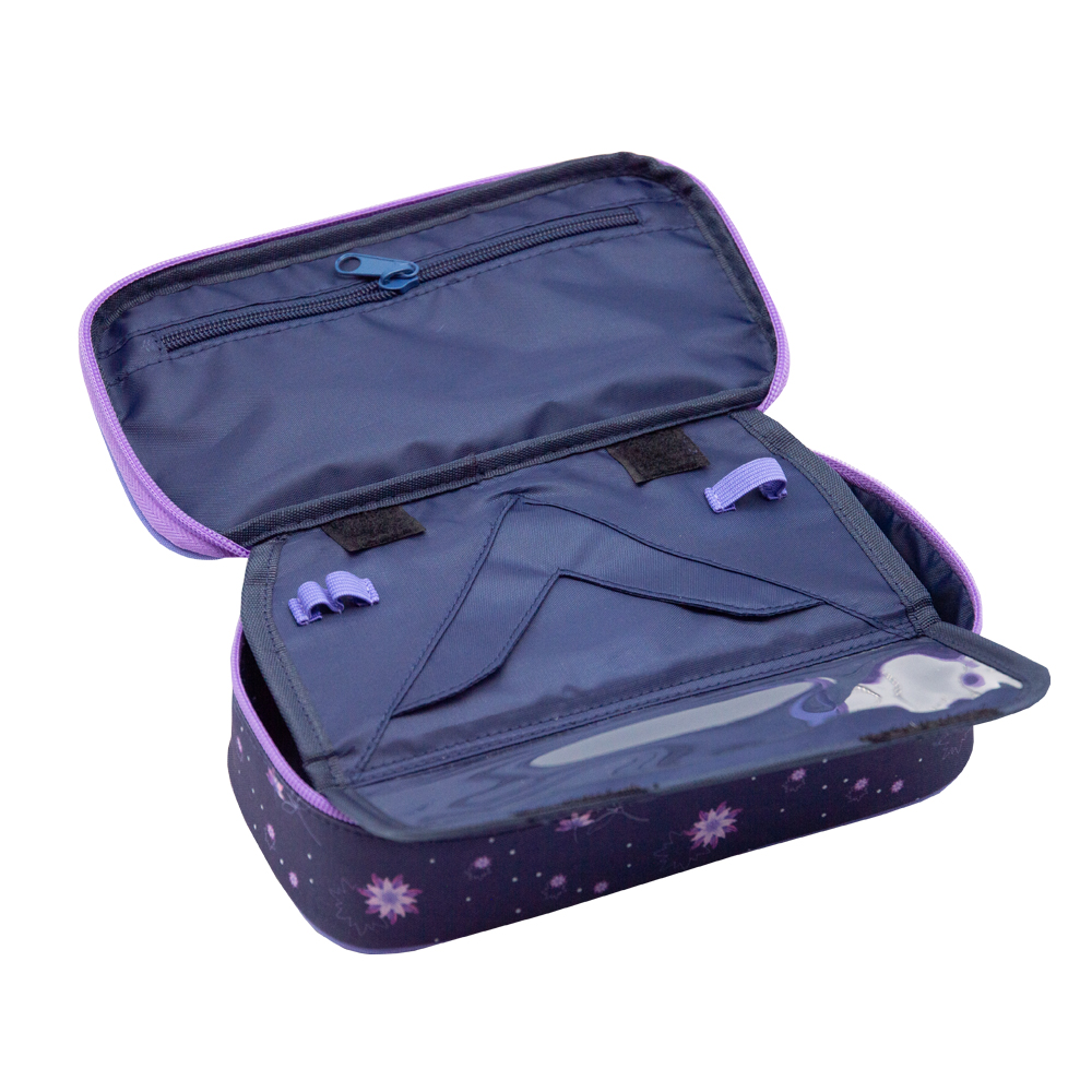 Školní pouzdro je opatřeno pevnými zipy, uzavíratelnou kapsičkou na zip, přihrádkou na pravítko a klopou s šesti poutky na psací potřeby. Pod klopou je místo pro volné uložení psacích potřeb nebo jiných drobností. Vhodné pro školáky na 2. stupni a starší studenty.
