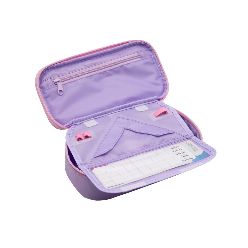 Školní pouzdro je opatřeno pevnými zipy, uzavíratelnou kapsičkou na zip, přihrádkou na pravítko a klopou s šesti poutky na psací potřeby. Pod klopou je místo pro volné uložení psacích potřeb nebo jiných drobností. Vhodné pro školáky na 2. stupni a starší studenty.