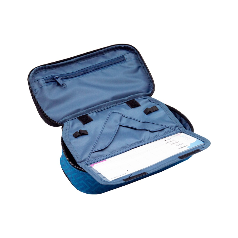 Školní pouzdro je opatřeno pevnými zipy, uzavíratelnou kapsičkou na zip, přihrádkou na pravítko a klopou s šesti poutky na psací potřeby. Pod klopou je místo pro volné uložení psacích potřeb nebo jiných drobností. Vhodné pro školáky na 2. stupni a starší studenty.