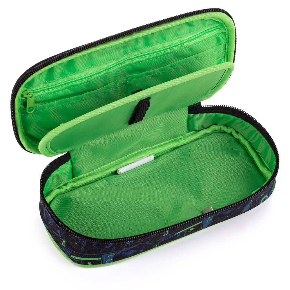 Školní pouzdro etue je opatřeno pevnými zipy, kapsičkou na zip a klopou s pevnými poutky po obou stranách. Pod klopou je místo pro volné uložení psacích potřeb nebo jiných drobností. Vhodné pro školáky na 2. stupni a starší studenty.