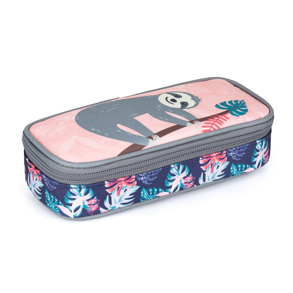 Školní pouzdro etue s motivem lenochoda. Pouzdro je opatřeno pevnými zipy, kapsičkou na zip a klopou s pevnými poutky po obou stranách. Pod klopou je místo pro volné uložení psacích potřeb nebo jiných drobností.