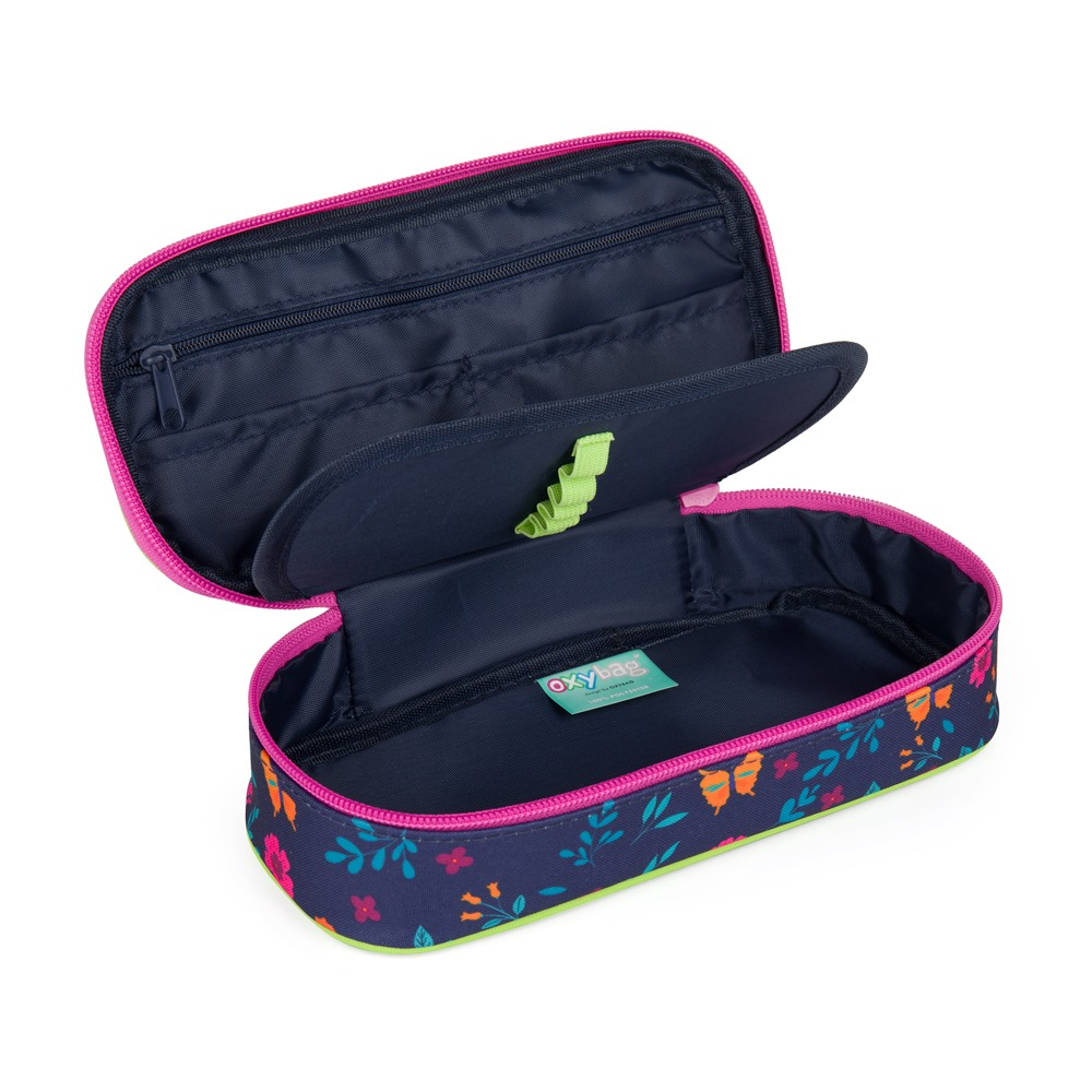 Školní pouzdro etue je opatřeno pevnými zipy, kapsičkou na zip a klopou s pevnými poutky po obou stranách. Pod klopou je místo pro volné uložení psacích potřeb nebo jiných drobností. Vhodné pro školáky na 2. stupni a starší studenty.