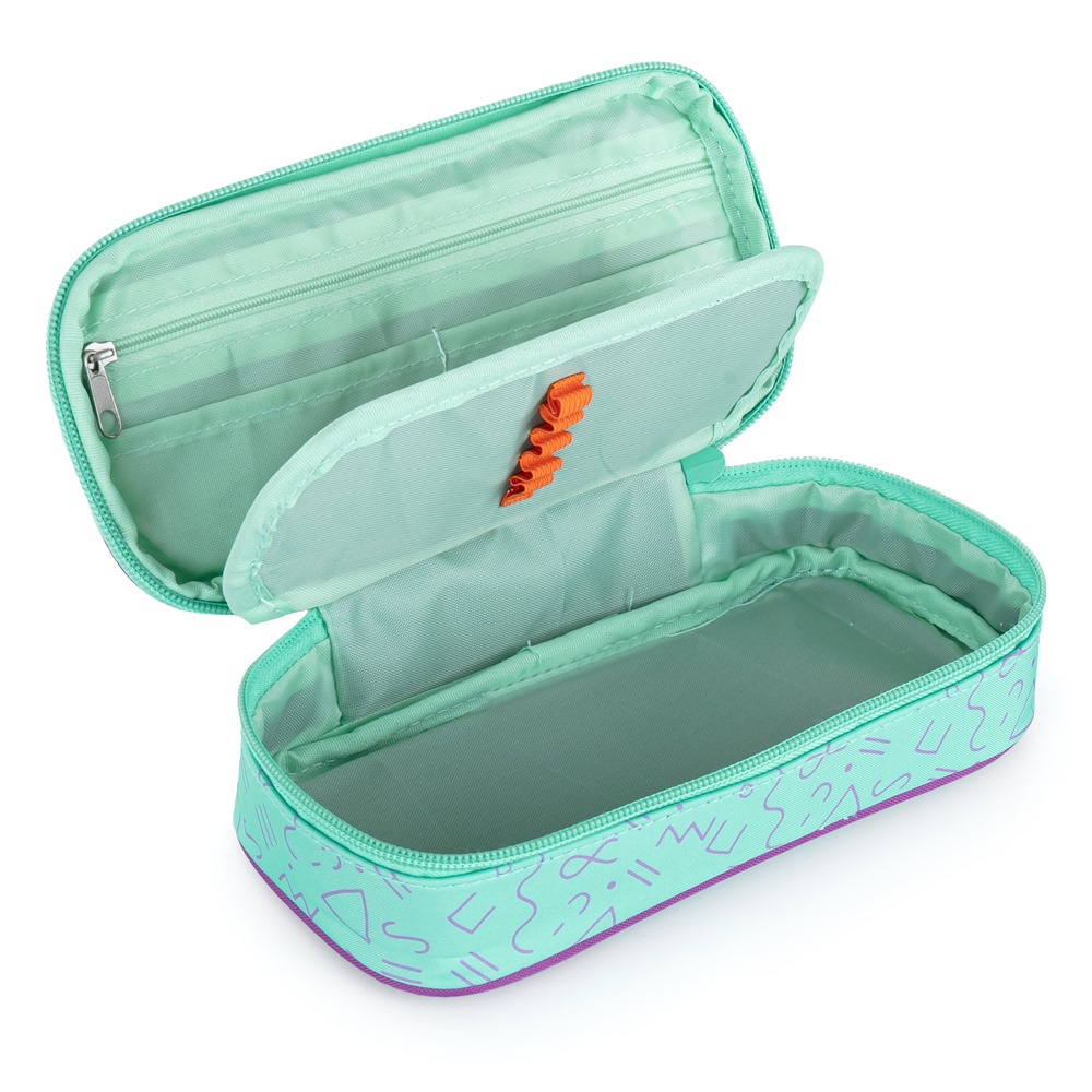 Školní pouzdro etue je opatřeno pevnými zipy, kapsičkou na zip a klopou s pevnými poutky po obou stranách. Pod klopou je místo pro volné uložení psacích potřeb nebo jiných drobností. Vhodné pro školáky na 2. stupni a starší studenty.