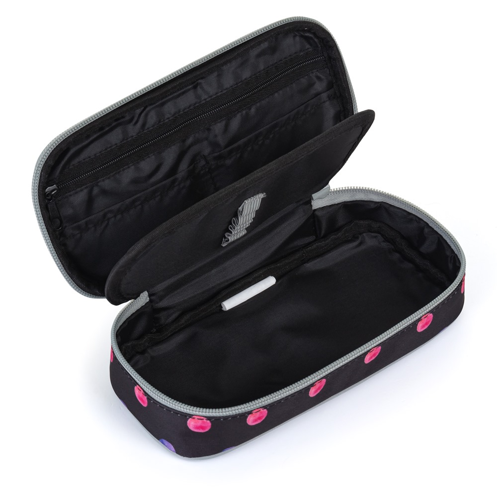 Školní pouzdro etue OXY v puntíkovém provedení. Pouzdro je opatřeno pevnými zipy, kapsičkou na zip a klopou s pevnými poutky po obou stranách. Pod klopou je místo pro volné uložení psacích potřeb nebo jiných drobností. Vhodné pro školáky na 2. stupni a starší studenty.