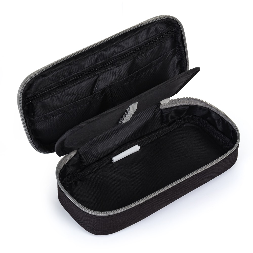 Školní pouzdro etue OXY v černočervveném provedení. Pouzdro je opatřeno pevnými zipy, kapsičkou na zip a klopou s pevnými poutky po obou stranách. Pod klopou je místo pro volné uložení psacích potřeb nebo jiných drobností. Vhodné pro školáky na 2. stupni a starší studenty.