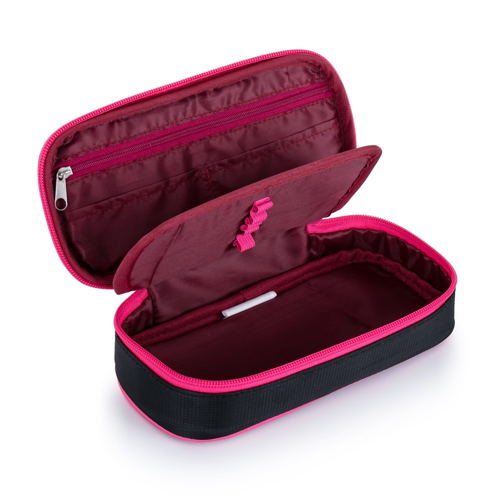 Školní pouzdro etue je opatřeno pevnými zipy, kapsičkou na zip a klopou s pevnými poutky po obou stranách. Pod klopou je místo pro volné uložení psacích potřeb nebo jiných drobností. Vhodné pro školáky na 2. stupni a starší studenty.