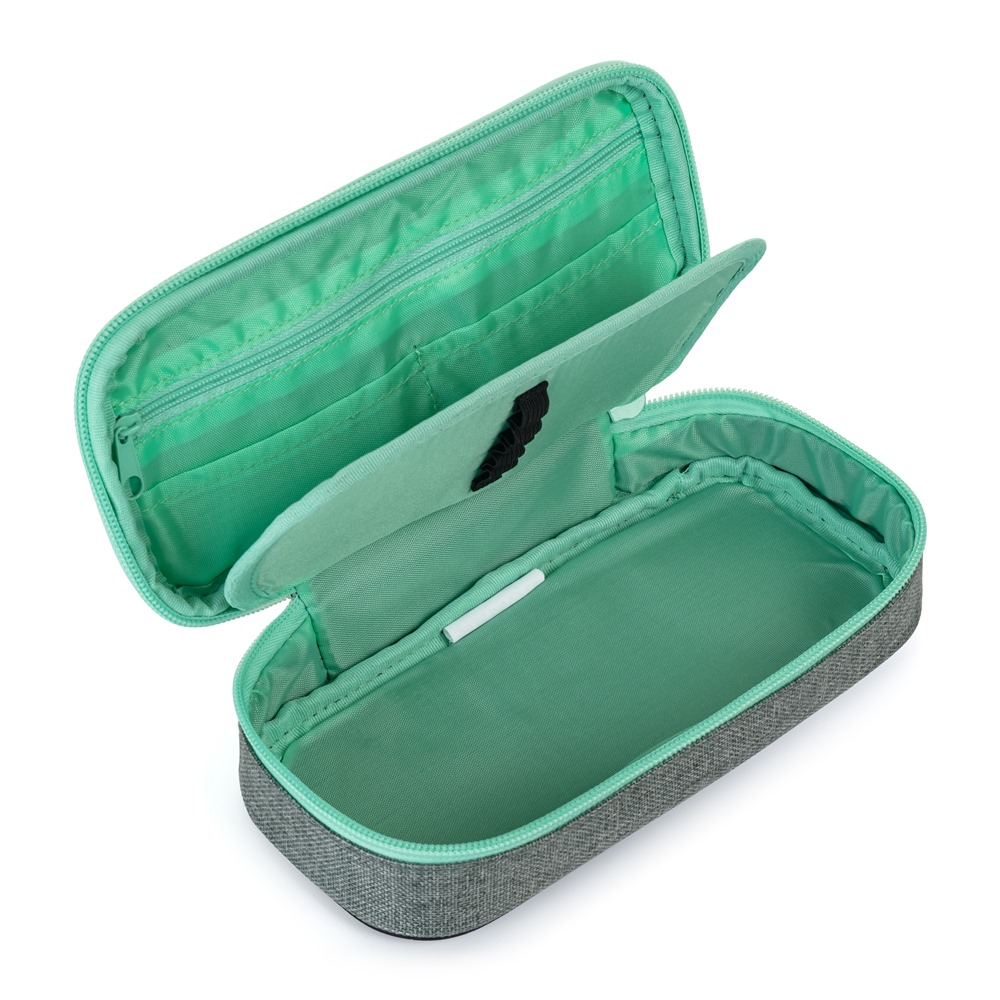 Školní pouzdro etue je opatřeno pevnými zipy, kapsičkou na zip a klopou s pevnými poutky po obou stranách. Pod klopou je místo pro volné uložení psacích potřeb nebo jiných drobností. Vhodné pro školáky na 2. stupni a starší studenty.