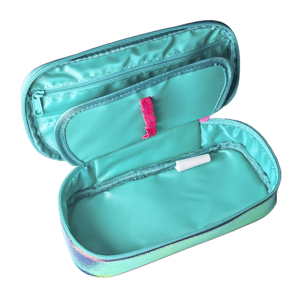 Školní pouzdro etue je opatřeno pevnými zipy, kapsičkou na zip a klopou s pevnými poutky po obou stranách. Pod klopou je místo pro volné uložení psacích potřeb nebo jiných drobností. Vhodné pro školáky na 2. stupni a starší studenty.