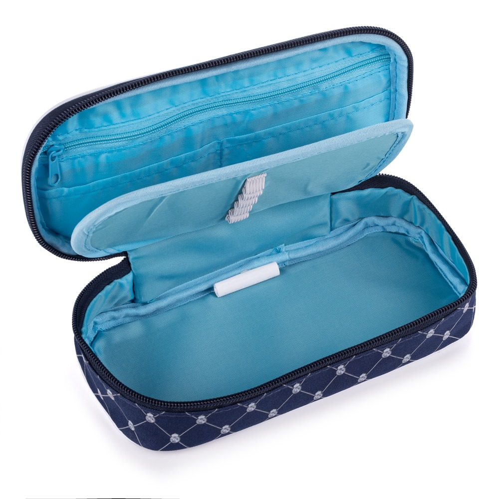 Školní pouzdro etue s motivem sportovního klubu Real Madrid. Pouzdro je opatřeno pevnými zipy, kapsičkou na zip a klopou s pevnými poutky po obou stranách. Pod klopou je místo pro volné uložení psacích potřeb nebo jiných drobností. Vhodné pro školáky na 2. stupni a starší studenty.