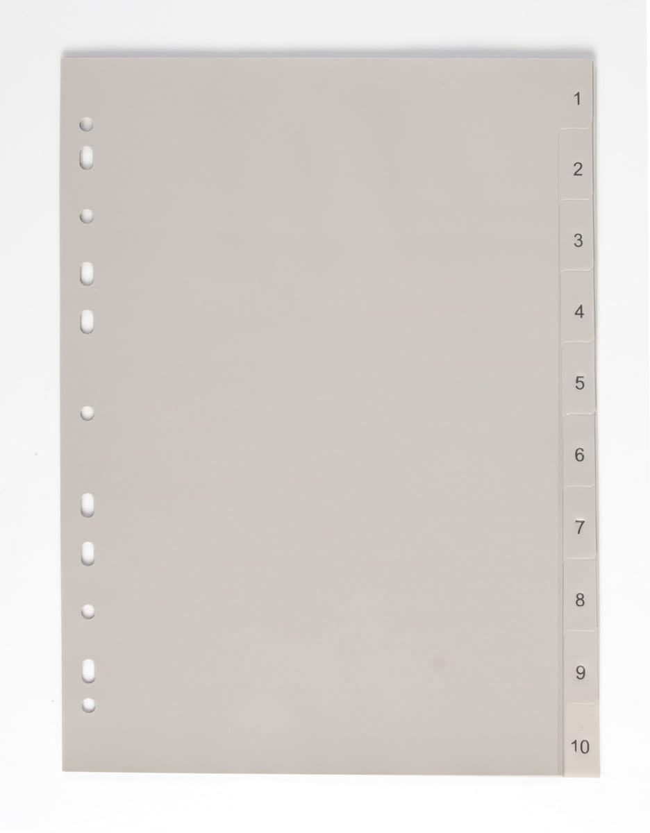 Rozdružovač, rozlišovač nebo rejstřík. Praktická pomůcka pro oddělování dokumentů, rejstřík 1-10, formát A4, šedá barva. Vhodné k zavěšení do pořadače. Polypropylen, síla 120my