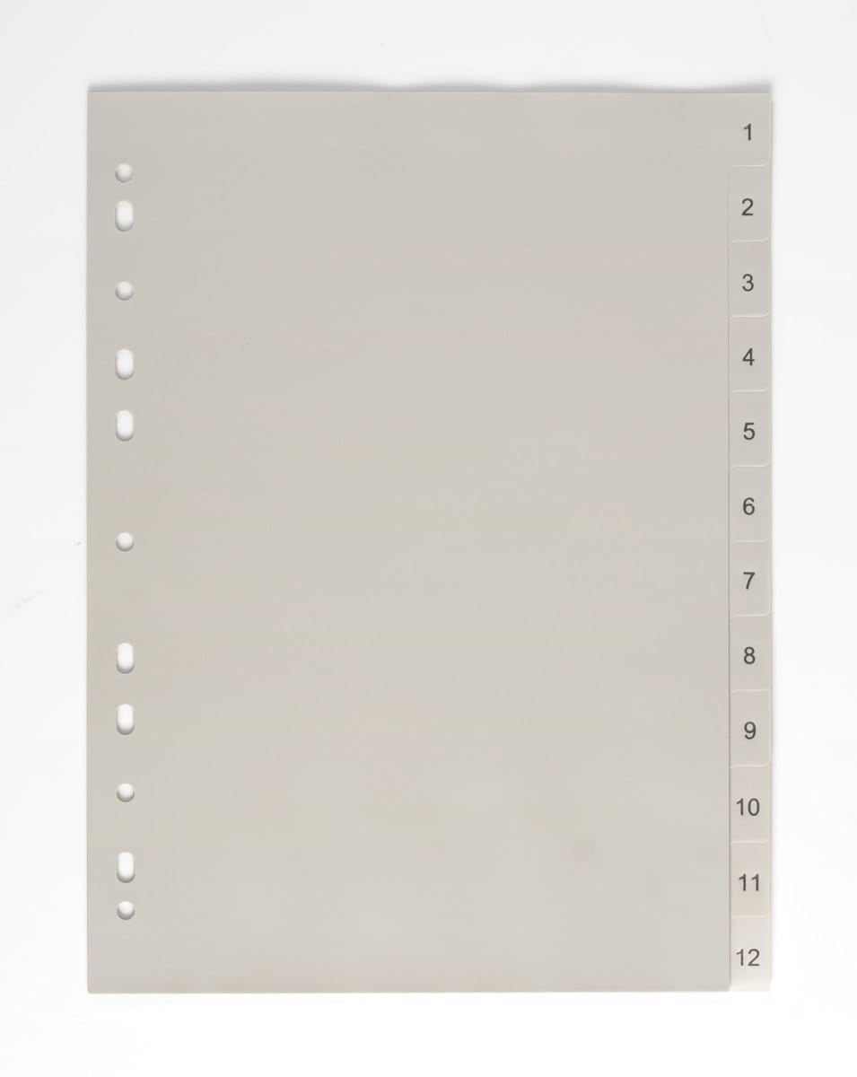 Rozdružovač, rozlišovač nebo rejstřík. Praktická pomůcka pro oddělování dokumentů, rejstřík 1-12, formát A4, šedá barva. Vhodné k zavěšení do pořadače. Polypropylen, síla 120my