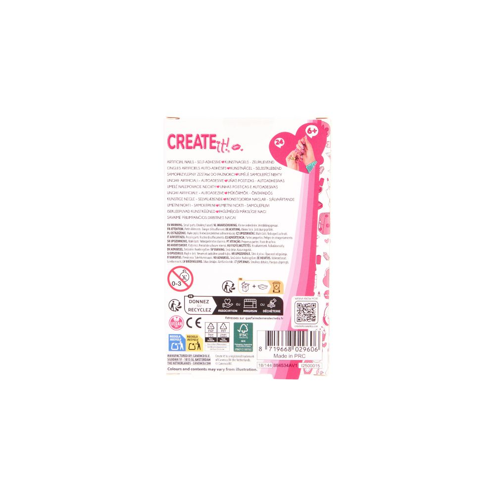 Dopřejte dětem radost z krásných nehtů bez starostí s lepidlem a nepořádkem. Create it! Artificial Nails Self Adhesive Set nabízí samolepicí nehty, které se snadno aplikují a stejně jednoduše odstraní. Stačí sloupnout ochrannou vrstvu, přiložit a jemně přitlačit. Ideální řešení na dětskou oslavu, focení nebo chvíle, kdy si chtějí připadat slavnostně. V balení najdete dvě stylové varianty. Cherry Blush pro jemný a elegantní vzhled a Blossom Glow pro hravý a barevný efekt. Nehty jsou navržené tak, aby byly bezpečné, jednoduché na použití a vhodné pro děti od 6 let.