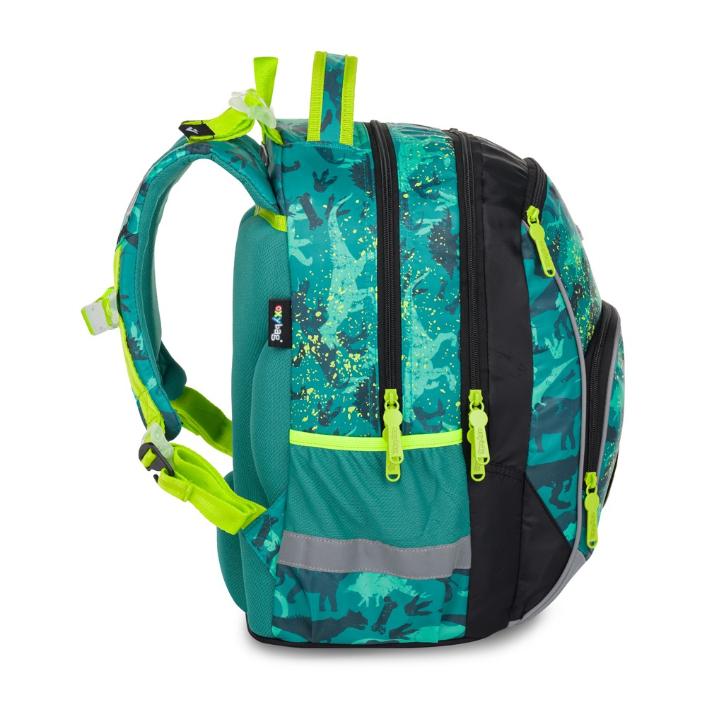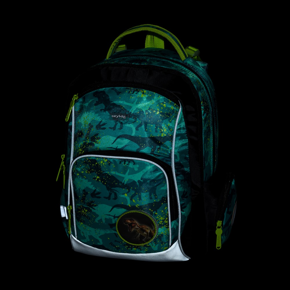 Školní batoh OXY GO zaujme moderním designem a promyšlenou funkčností. Má anatomicky tvarovaná, prodyšná záda a nastavitelné ramenní popruhy pro pohodlné nošení. Přidané háčky umožňují uchycení dlouhých popruhů. Vnitřní kapsy nabízí dostatek místa na učebnice, sešity i další potřeby, pevné nepromokavé dno chrání obsah před ušpiněním a protečením. Boční kapsy, jedna na zip a jedna otevřená, slouží např. na láhev. Reflexní prvky zajišťují bezpečnost. Batoh je ideální pro děti od 1. do 3. třídy vysoké od 125 cm. Délka zádového panelu je 39 cm, objem 22 l, hmotnost 930 g, nosnost 8 kg. Sáček: Praktický na cvičky nebo volnočasové aktivity, uzavírá se šňůrkami. Penál: Jednopatrový se dvěma chlopněmi, poutka na psací potřeby a průhledná fólie na rozvrh hodin.