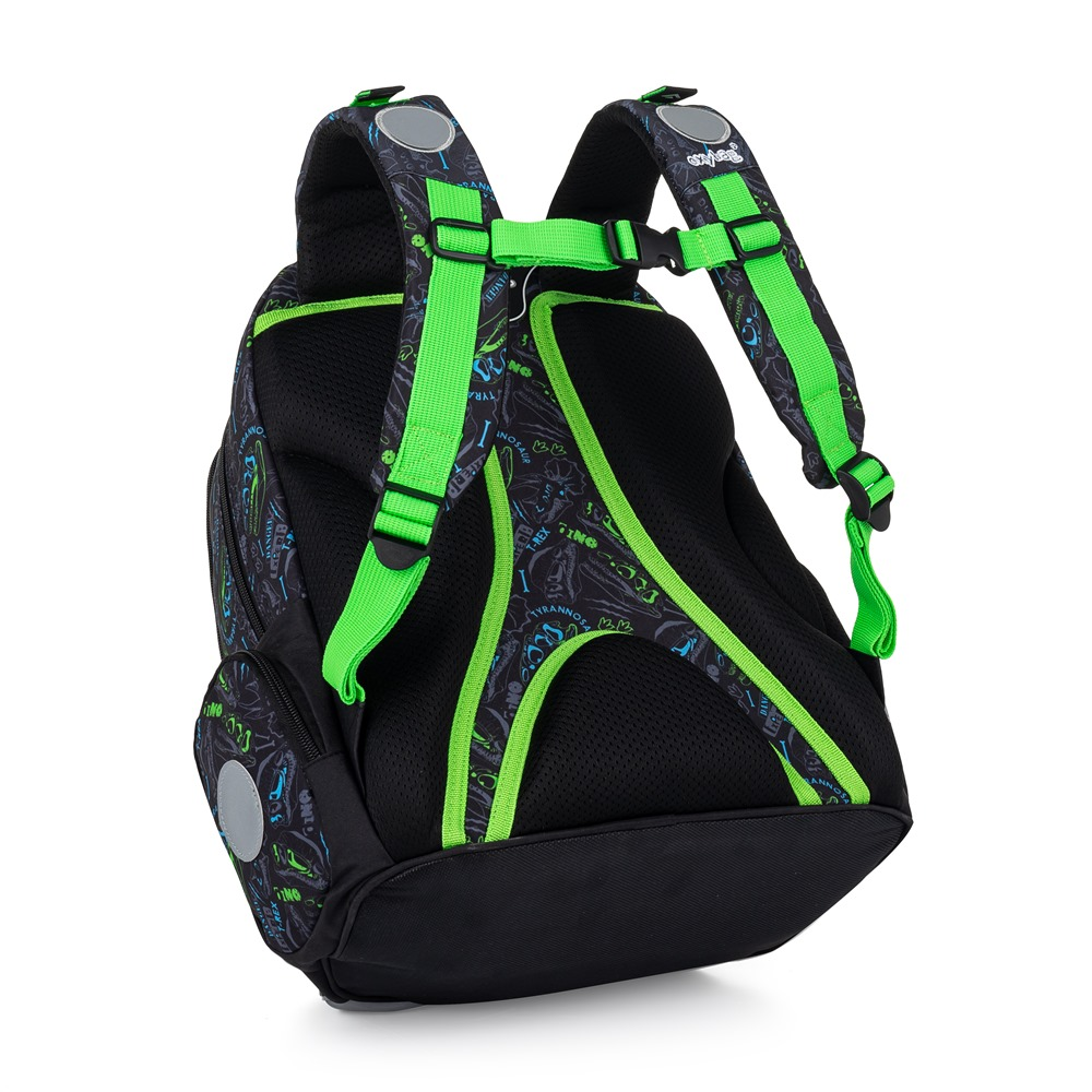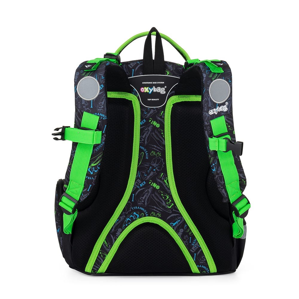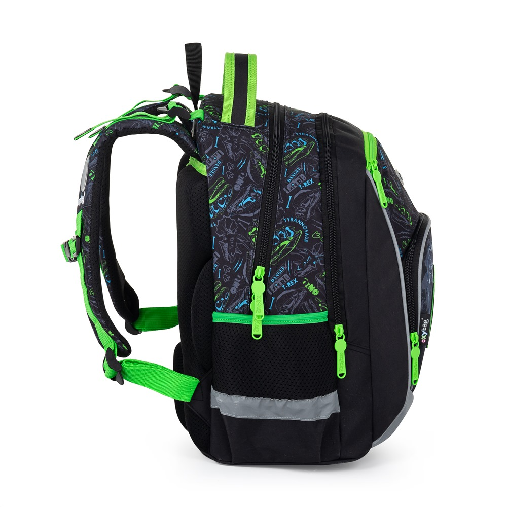 Školní batoh z řady OXY GO ve svém designovém provedení zaujme každého kluka i holku. Perfektní tvar batohu ukrývá nejen anatomicky tvarovaná a prodyšná záda, ale také možnost nastavit si ramenní popruhy pro lepší pohodlí a komfortnější nošení. Dvě vnitřní kapsy nabízí dostatek prostoru pro učebnice, sešity i věci na volný čas. Pevné dno zabraňuje jak ušpinění zvenku, tak protečení čehokoliv, co se vylije uvnitř. Po stranách najdete dvě větší kapsy. Batoh nabízí velkorysé množství nejrůznějších kapes, ať už velkých nebo i malých. Mysleli jsme také na bezpečnost vašich dětí, proto batohu nechybějí reflexní prvky. Batoh je ideální na první stupeň 1. - 3. třídu pro děti vysoké od 125 cm. Penál: Jednopatrový školní penál s 2 chlopněmi, prázdný obsahuje 25 gumových poutek pro uchycení psacích potřeb. Na vnitřních chlopních jsou průhledné fólie pro rozvrh hodin. Sáček: Sáček na přezůvky. Uzavírání stažením šňůrek, možnost nosit i na zádech nebo připevnit ke školnímu batohu. Materiál 100% polyester.