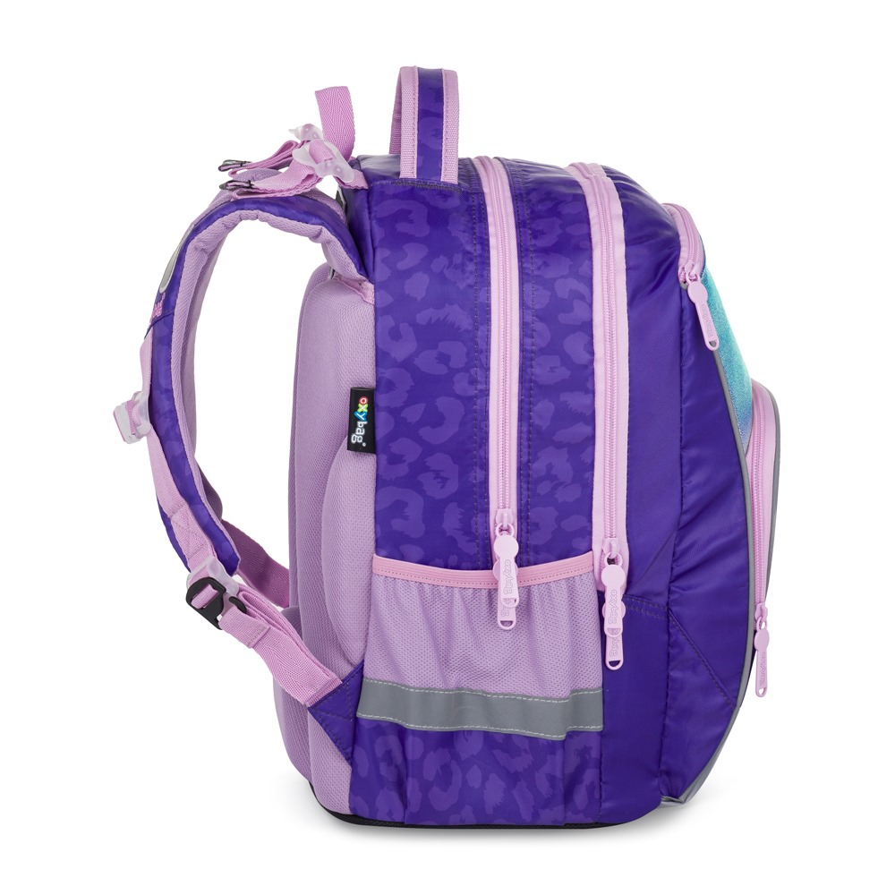 Školní batoh OXY GO zaujme moderním designem a promyšlenou funkčností. Má anatomicky tvarovaná, prodyšná záda a nastavitelné ramenní popruhy pro pohodlné nošení. Přidané háčky umožňují uchycení dlouhých popruhů. Vnitřní kapsy nabízí dostatek místa na učebnice, sešity i další potřeby, pevné nepromokavé dno chrání obsah před ušpiněním a protečením. Boční kapsy, jedna na zip a jedna otevřená, slouží např. na láhev. Reflexní prvky zajišťují bezpečnost. Batoh je ideální pro děti od 1. do 3. třídy vysoké od 125 cm. Délka zádového panelu je 39 cm, objem 22 l, hmotnost 930 g, nosnost 8 kg. Sáček: Praktický na cvičky nebo volnočasové aktivity, uzavírá se šňůrkami. Penál: Jednopatrový se dvěma chlopněmi, poutka na psací potřeby a průhledná fólie na rozvrh hodin.