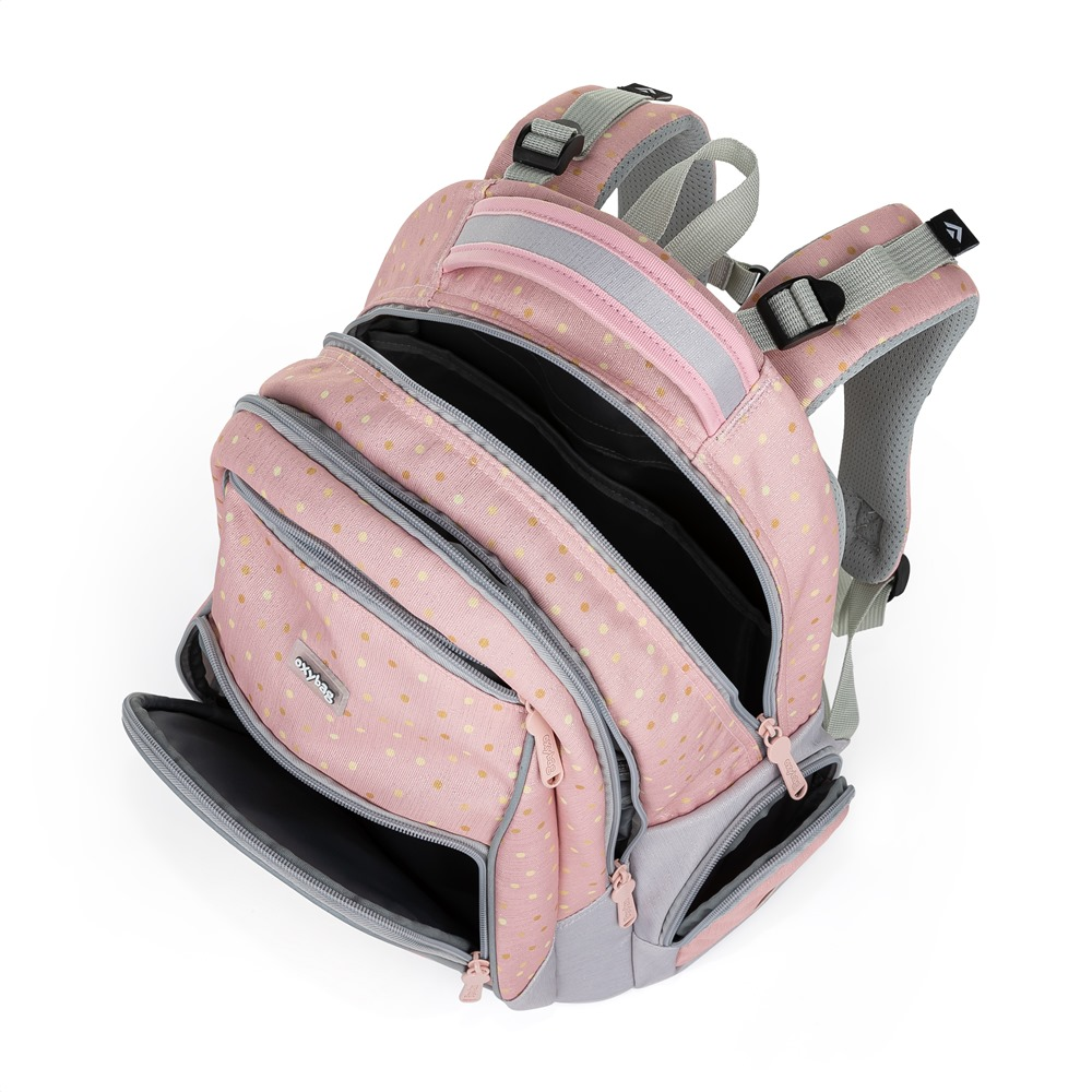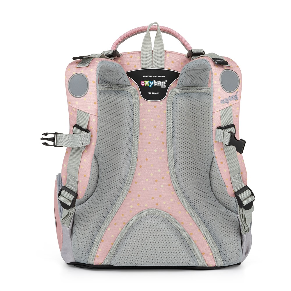 Školní batoh OXY GO zaujme moderním designem a promyšlenou funkčností. Má anatomicky tvarovaná, prodyšná záda a nastavitelné ramenní popruhy pro pohodlné nošení. Přidané háčky umožňují uchycení dlouhých popruhů. Vnitřní kapsy nabízí dostatek místa na učebnice, sešity i další potřeby, pevné nepromokavé dno chrání obsah před ušpiněním a protečením. Boční kapsy, jedna na zip a jedna otevřená, slouží např. na láhev. Reflexní prvky zajišťují bezpečnost. Batoh je ideální pro děti od 1. do 3. třídy vysoké od 125 cm. Délka zádového panelu je 39 cm, objem 22 l, hmotnost 930 g, nosnost 8 kg. Sáček: Praktický na cvičky nebo volnočasové aktivity, uzavírá se šňůrkami. Penál: Jednopatrový se dvěma chlopněmi, poutka na psací potřeby a průhledná fólie na rozvrh hodin.