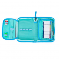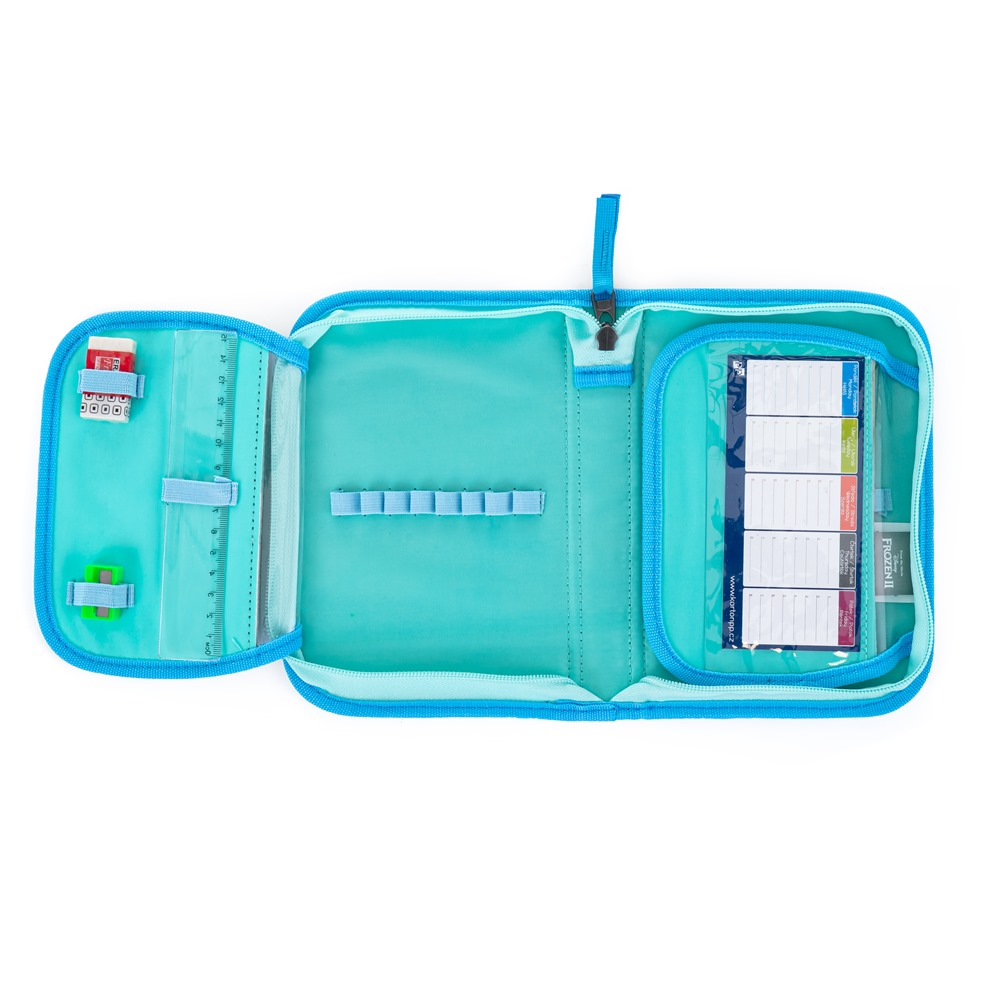 Penál: Jednopatrový školní penál se dvěma chlopněmi bez náplně. Gumová poutka k uchycení psacích potřeb. Na vnitřní chlopni je průhledná fólie pro rozvrh hodin.