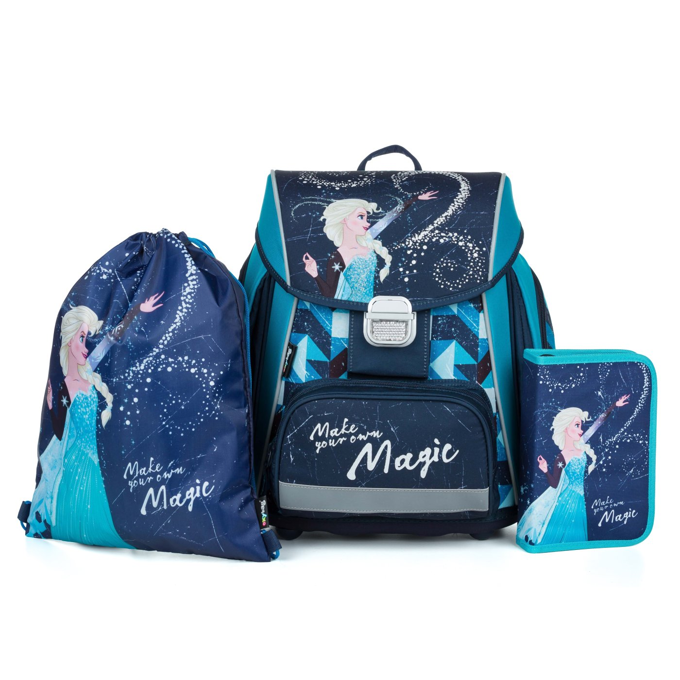 Školní set pro prvňáčka s motivem princezny Elsy z Ledového království. Set obsahuje školní batoh Premium, sáček na cvičky a nenaplněný jednopatrový penál.