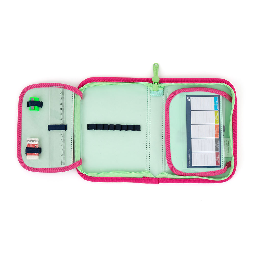 Penál: Jednopatrový školní penál se dvěma chlopněmi bez náplně. Gumová poutka k uchycení psacích potřeb. Na vnitřní chlopni je průhledná fólie pro rozvrh hodin.