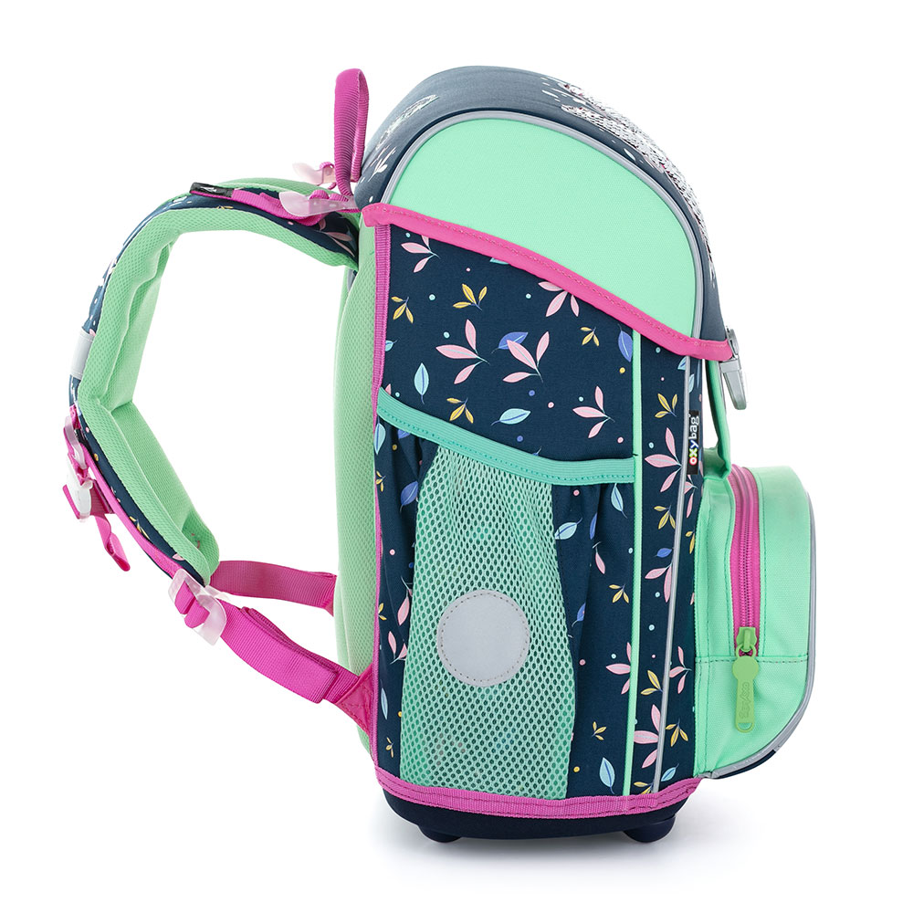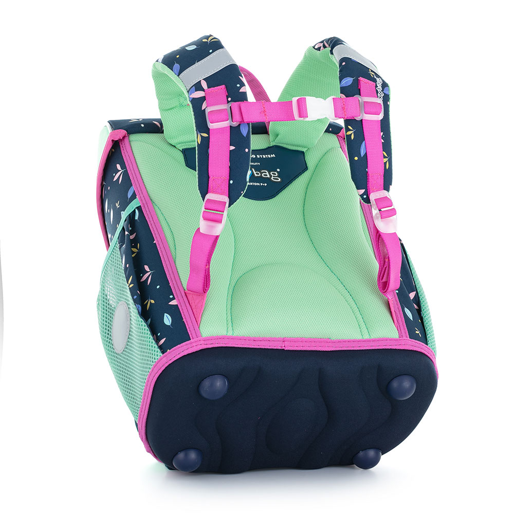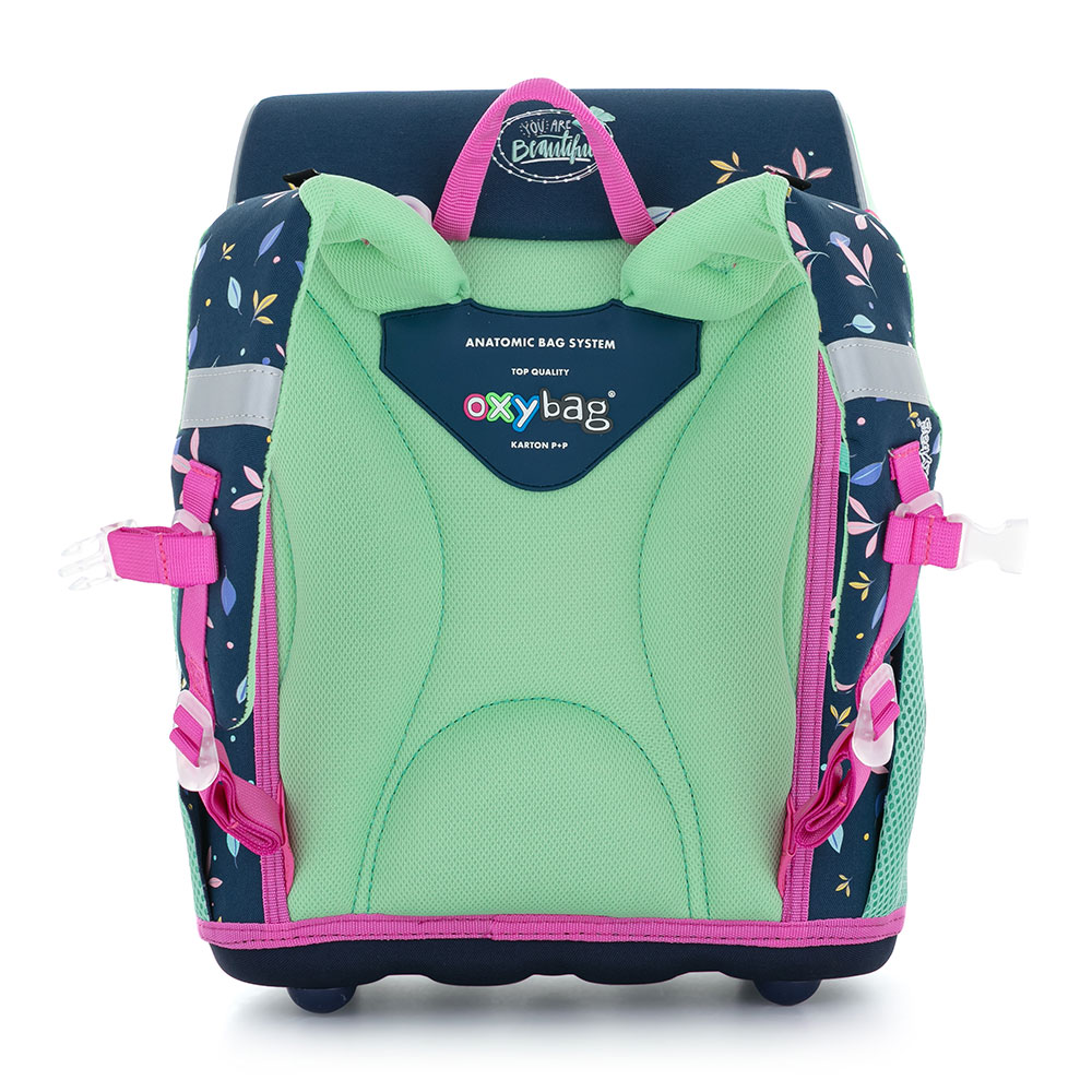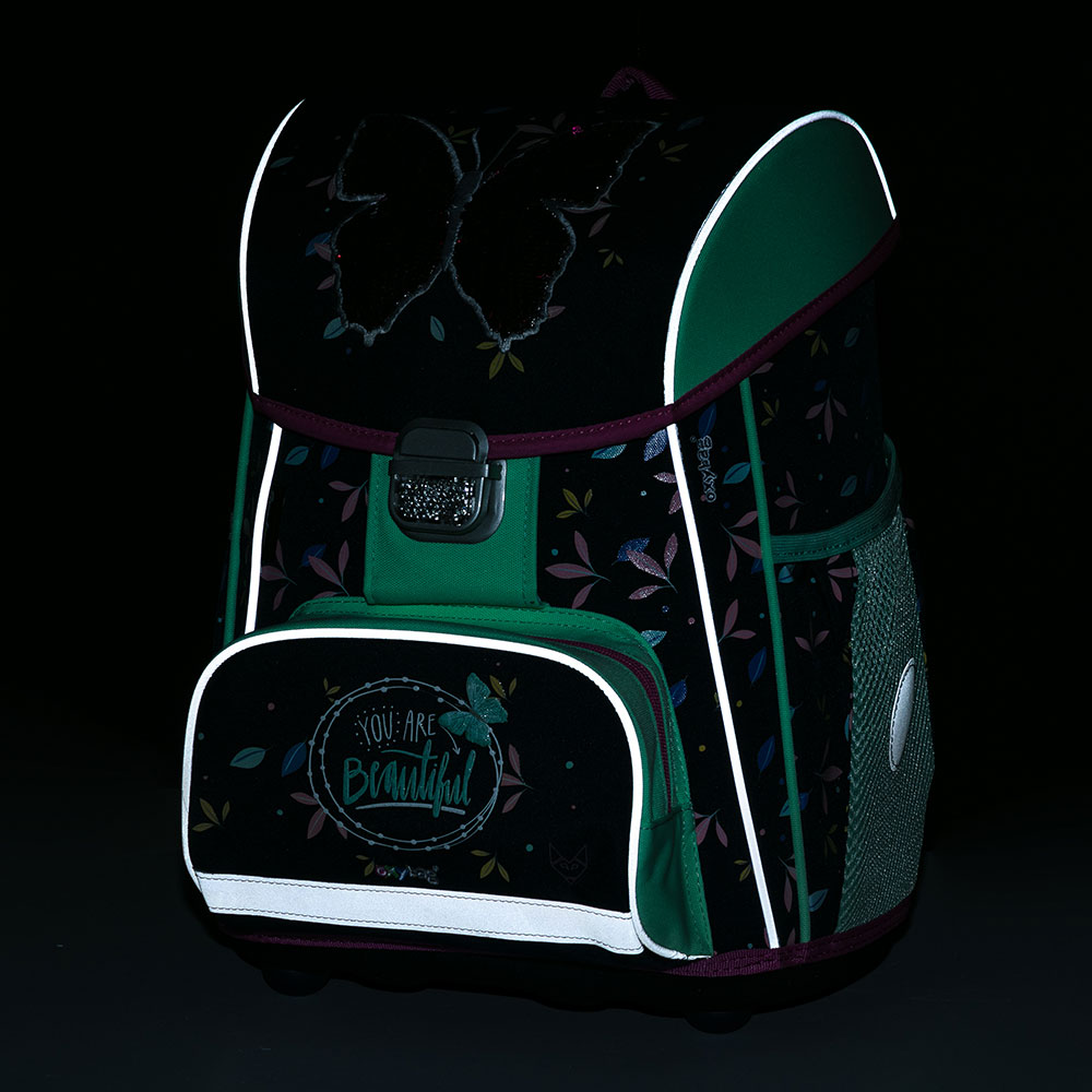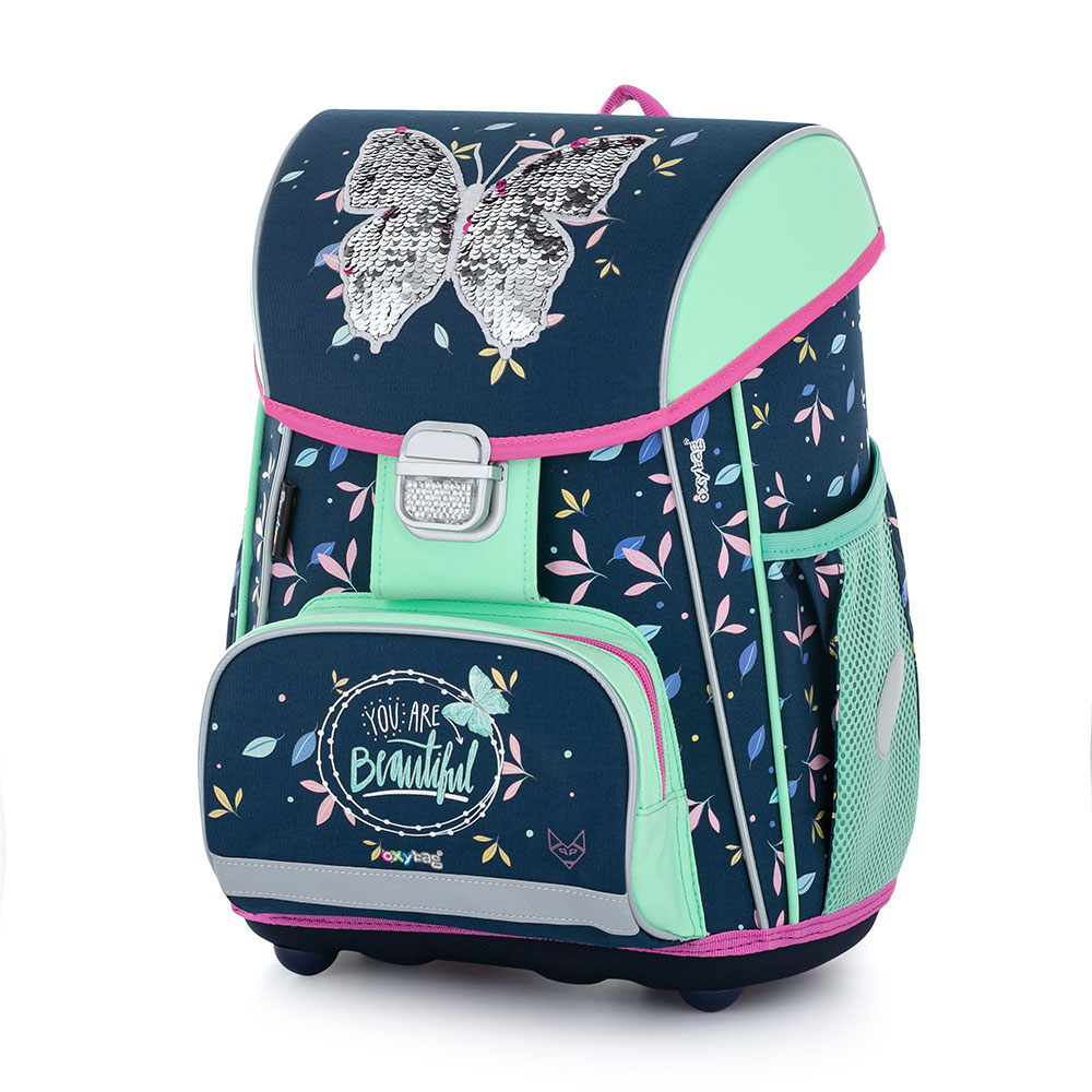 ktovka: Školní aktovka z řady Premium s motivem motýla je anatomicky tvarovaná a zajišťuje tak správné usazení na zádech. Vyztužená záda a vnitřní výztuha udržují stálý tvar batohu. Polstrování je z příjemného prodyšného materiálu, široké měkčené popruhy jsou navrženy tak, aby dokonale přilnuly a rovnoměrně zatížily ramena dítěte. Aktovka se skládá z jedné prostorné komory, kam se pohodlně vejdou všechny školní pomůcky pro děti v 1. a ve 2. třídě. Dno batohu je z pevného materiálu, chrání tím obsah před převržením a vysypáním. Zapínání je na bezpečnostní přezku. Přední kapsička je určena na svačinu, nechybí řada reflexních prvků, díky kterým je aktovka viditelnější.