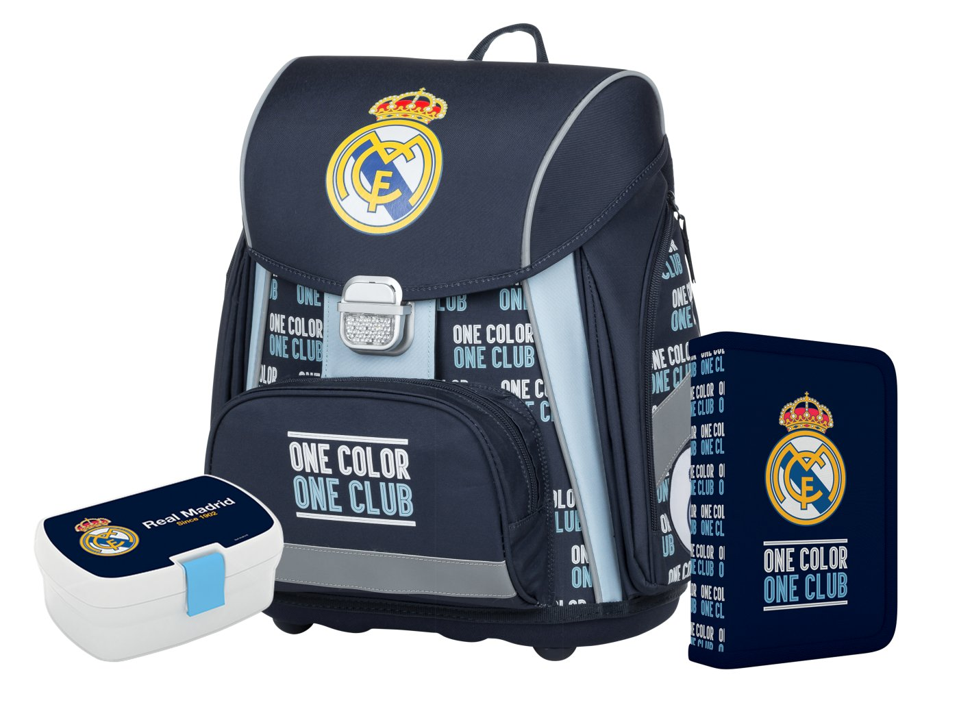 Školní set pro prvňáčka s motivem sportovního klubu Real Madrid. Set obsahuje školní batoh Premium, svačinový box a nenaplněný jednopatrový penál.