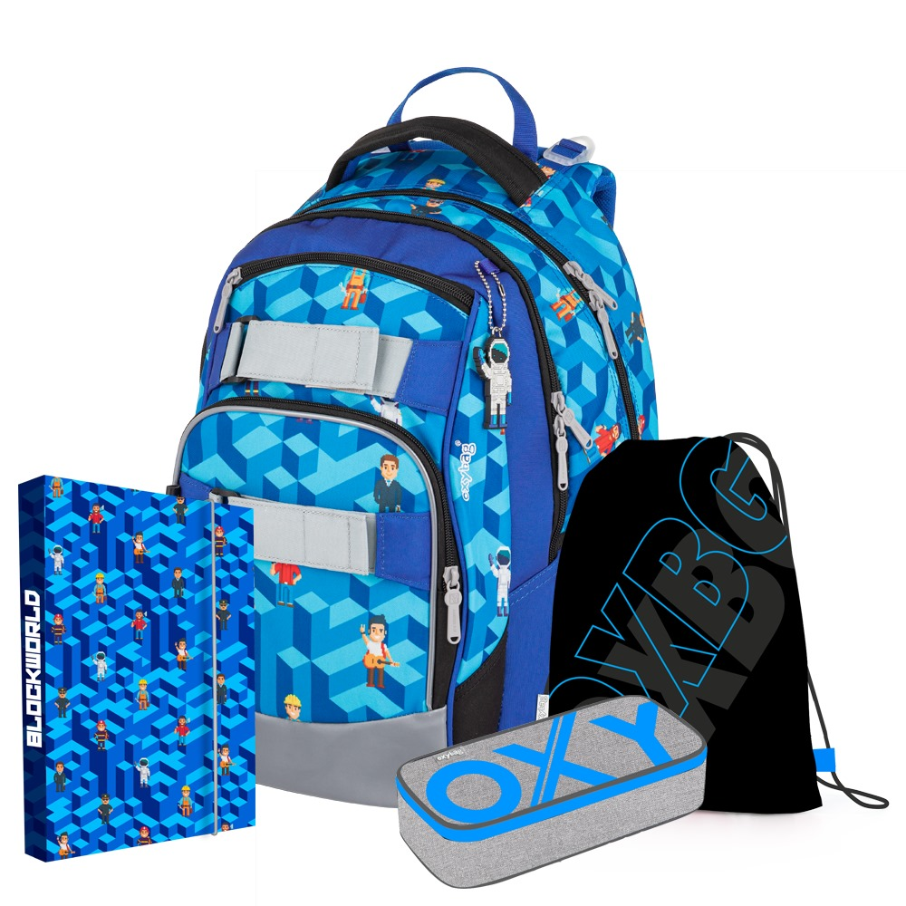 Školní batoh OXY Style Mini ve zvýhodněném setu s pouzdrem, vakem na záda a boxem na sešity. Rozměry batohu: 460 x 320 x 150 mm