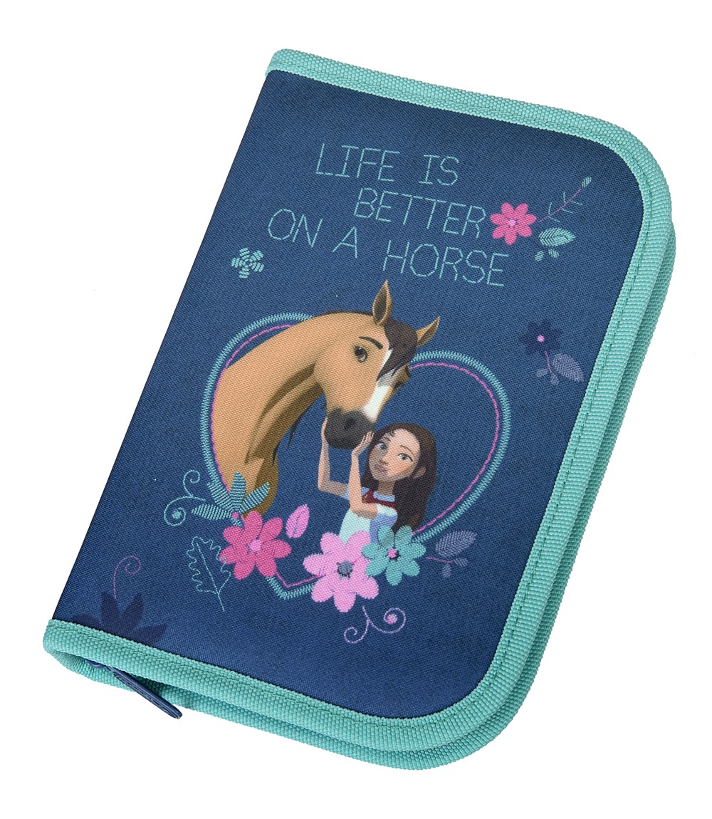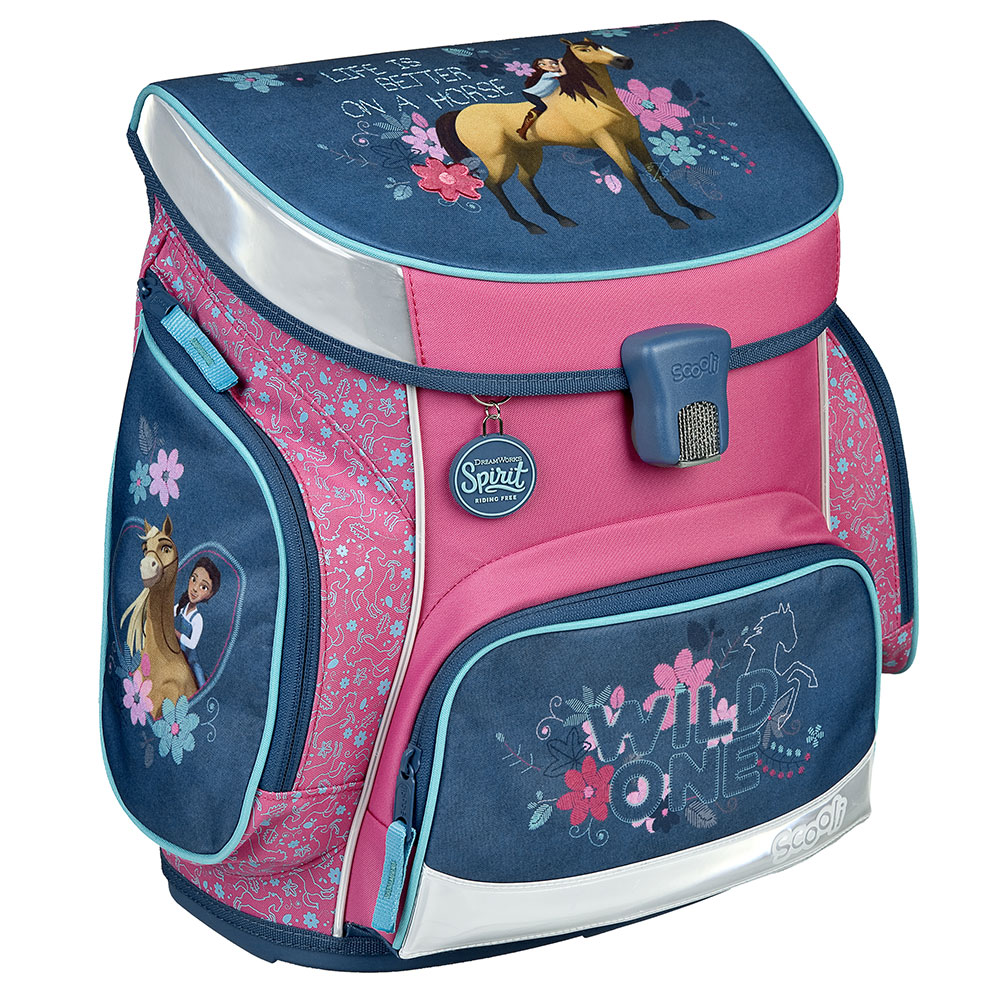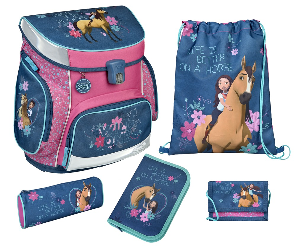 Školní set pro prvňáčka Scooli s motivem Spirit. Set obsahuje školní batoh, sáček na cvičky, naplněný jednopatrový penál, etui a peněženku.