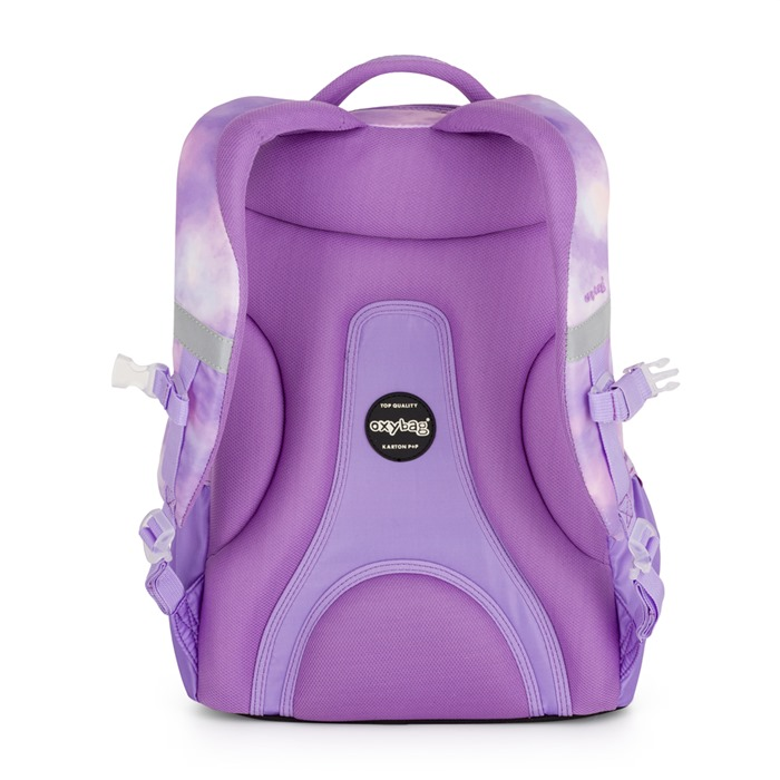 Školní batoh z řady OXY Ombre je ideální pro školáky od 3. třídy. Anatomicky tvarovaný zádový panel, polstrované ramenní popruhy a nastavitelný hrudní popruh zajistí záda jako v bavlnce každému školákovi. Pevné dno zabraňuje převrhnutí samostatně stojícího batohu. Batoh disponuje dvěma prostornými kapsami na všechny potřebné školní pomůcky. V bočních postranních kapsách na gumu je prostor pro láhev na pití, která je snadno dostupná pro doplnění pitného režimu každého školáka. Do přední kapsičky se snadno schová menší svačina. Nechybí řada reflexních prvků. Batoh je vhodný pro děti vysoké od 136 cm. Délka zádového panelu je 43 cm, objem činí 28 l, hmotnost batohu je 960 g a jeho nosnost je 8 kg.