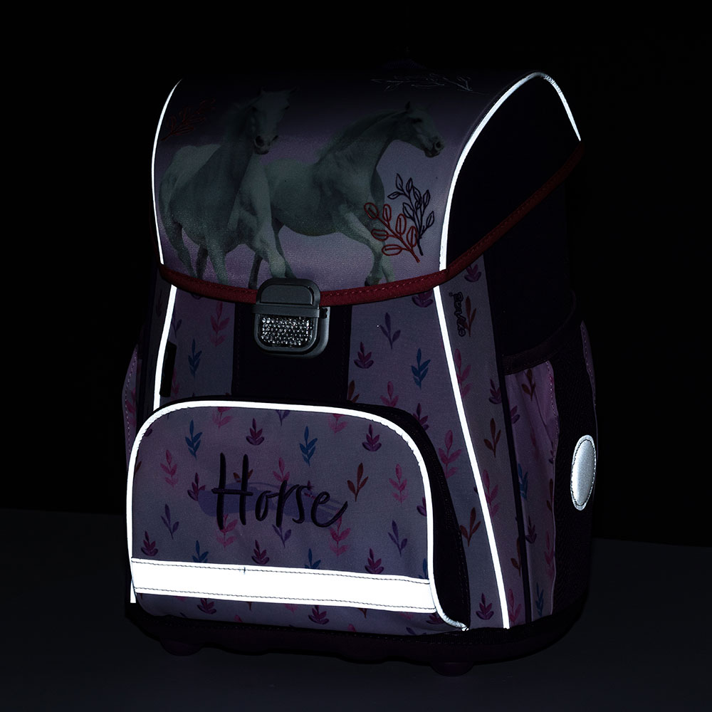 Školní aktovka z řady Premium s motivem koně je anatomicky tvarovaná a zajišťuje tak správné usazení na zádech. Vyztužená záda a vnitřní výztuha udržují stálý tvar batohu. Polstrování je z příjemného prodyšného materiálu, široké měkčené popruhy jsou navrženy tak, aby dokonale přilnuly a rovnoměrně zatížily ramena dítěte. Aktovka se skládá z jedné prostorné komory, kam se pohodlně vejdou všechny školní pomůcky pro děti v 1. a ve 2. třídě. Dno batohu je z pevného materiálu, chrání tím obsah před převržením a vysypáním. Zapínání je na bezpečnostní přezku. Přední kapsička je určena na svačinu, nechybí řada reflexních prvků, díky kterým je aktovka viditelnější.