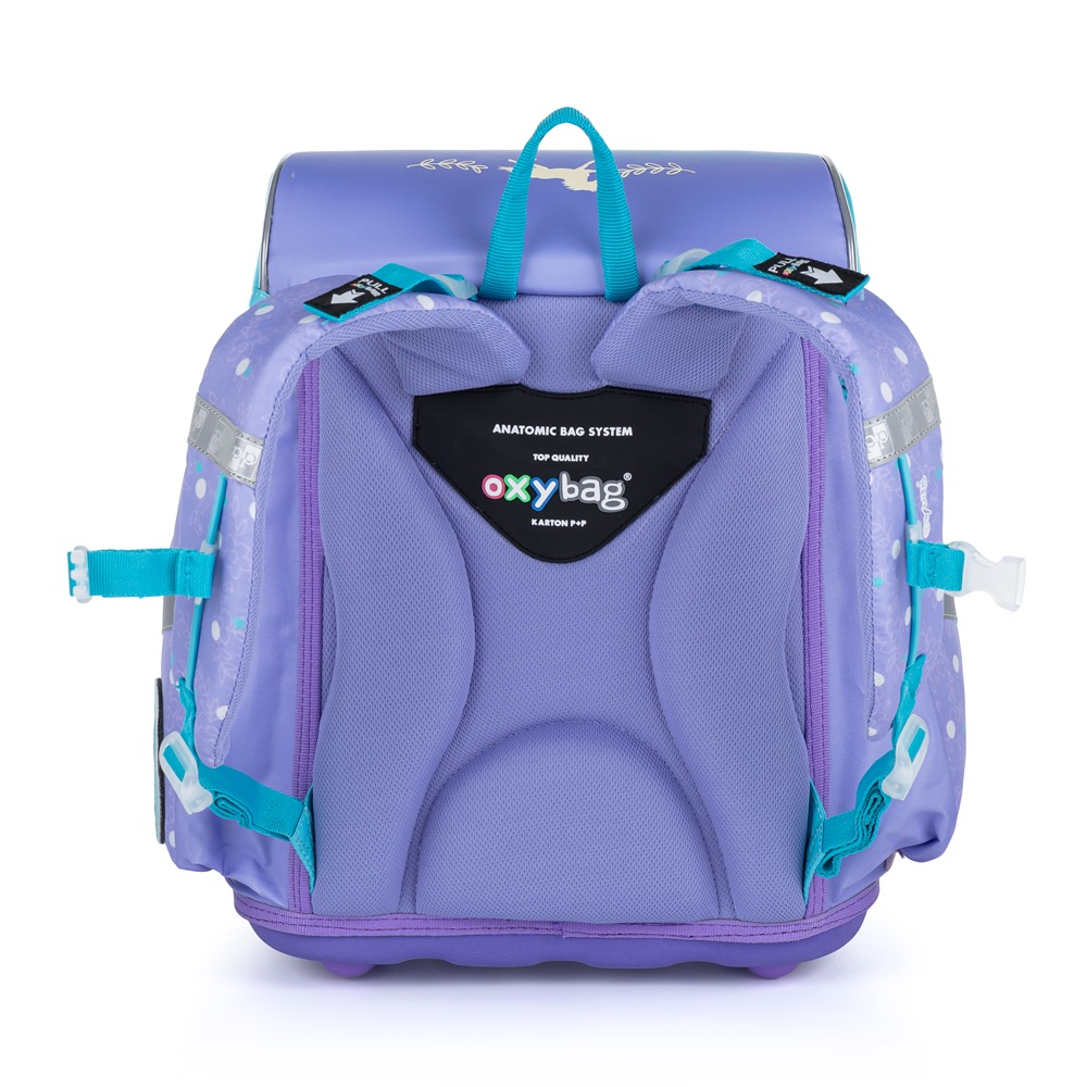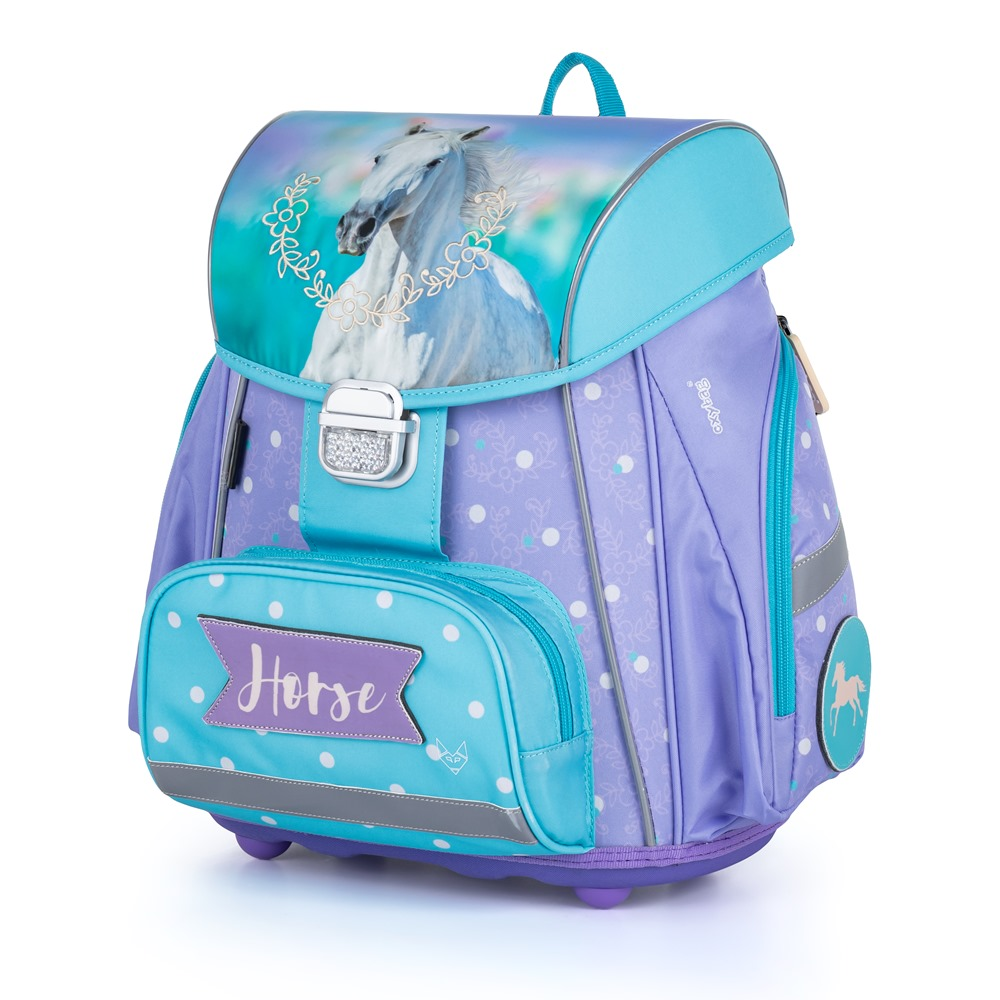 Školní aktovka z řady Premium s motivem koně je anatomicky tvarovaná a zajišťuje tak správné usazení na zádech. Vyztužená záda a vnitřní výztuha udržují stálý tvar batohu. Polstrování je z příjemného prodyšného materiálu, široké měkčené popruhy jsou navrženy tak, aby dokonale přilnuly a rovnoměrně zatížily ramena dítěte. Aktovka se skládá z jedné prostorné komory, kam se pohodlně vejdou všechny školní pomůcky pro děti v 1. a ve 2. třídě. Dno batohu je z pevného materiálu, chrání tím obsah před převržením a vysypáním. Zapínání je na bezpečnostní přezku. Přední kapsička je určena na svačinu, nechybí řada reflexních prvků, díky kterým je aktovka viditelnější.