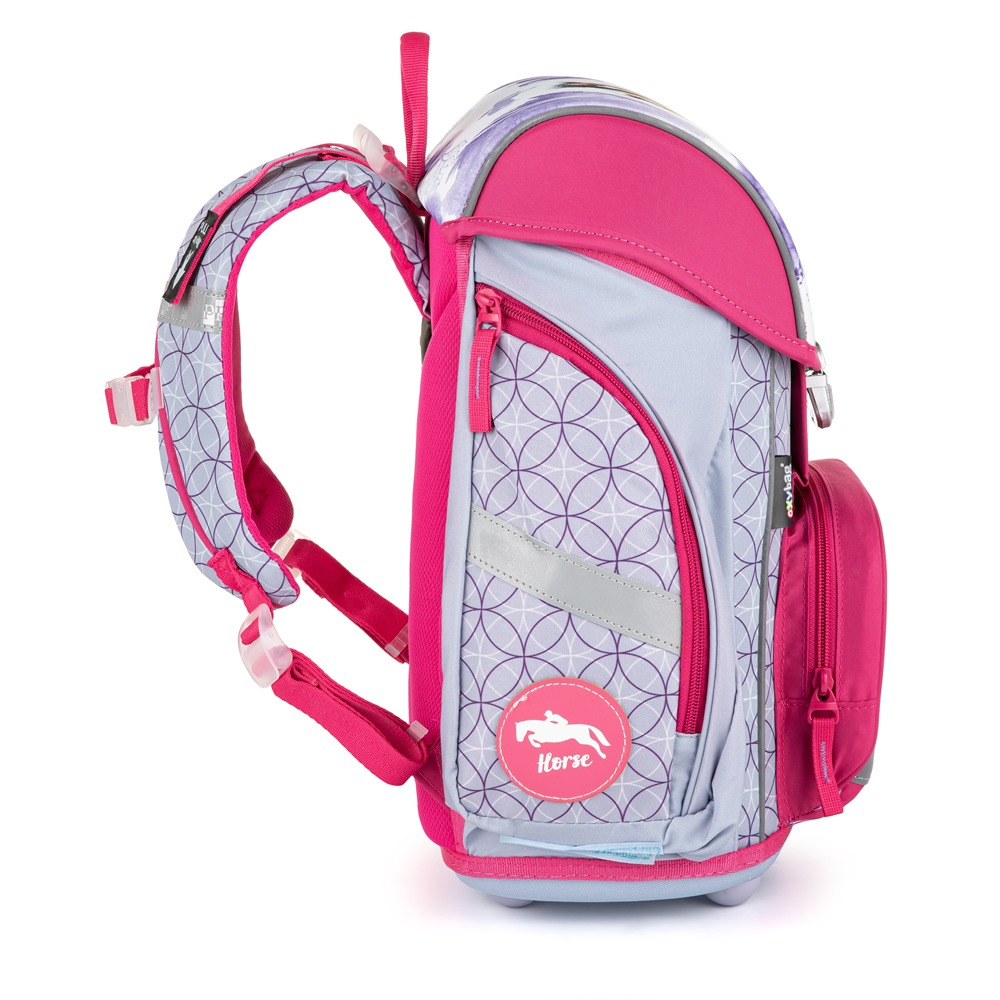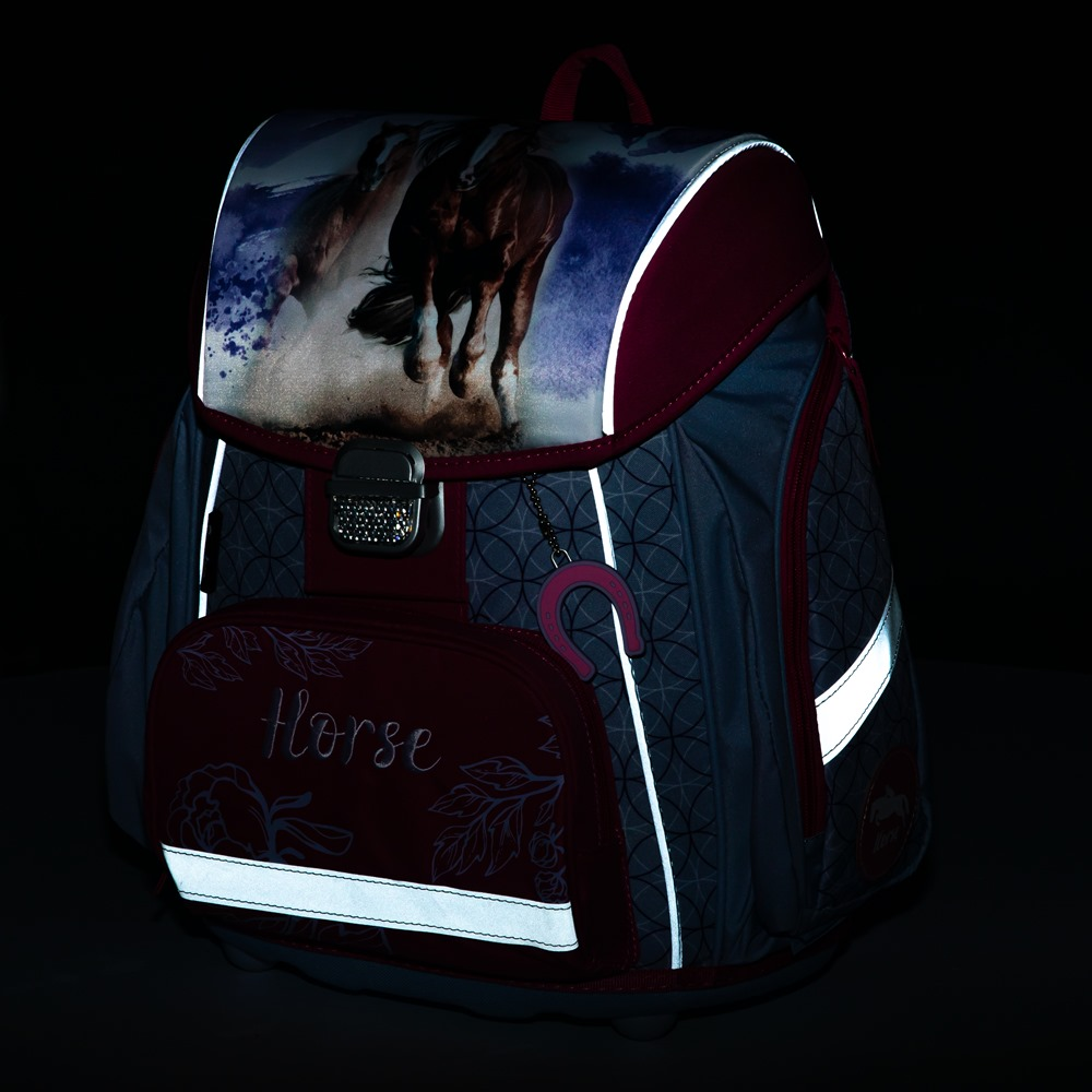 Školní aktovka z řady Premium s motivem koně je anatomicky tvarovaná a zajišťuje tak správné usazení na zádech. Vyztužená záda a vnitřní výztuha udržují stálý tvar batohu. Polstrování je z příjemného prodyšného materiálu, široké měkčené popruhy jsou navrženy tak, aby dokonale přilnuly a rovnoměrně zatížily ramena dítěte. Aktovka se skládá z jedné prostorné komory, kam se pohodlně vejdou všechny školní pomůcky pro děti v 1. a ve 2. třídě. Dno batohu je z pevného materiálu, chrání tím obsah před převržením a vysypáním. Zapínání je na bezpečnostní přezku. Přední kapsička je určena na svačinu, nechybí řada reflexních prvků, díky kterým je aktovka viditelnější.