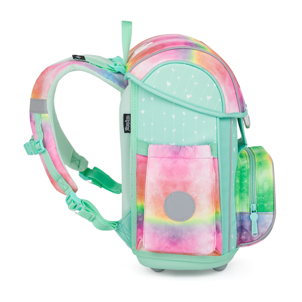 Školní aktovka z řady Premium je anatomicky tvarovaná a zajišťuje tak správné usazení na zádech. Vyztužená záda a vnitřní výztuha udržují stálý tvar batohu. Polstrování je z příjemného prodyšného materiálu, široké měkčené popruhy jsou navrženy tak, aby dokonale přilnuly a rovnoměrně zatížily ramena dítěte. Aktovka se skládá z jedné prostorné komory, kam se pohodlně vejdou všechny školní pomůcky pro děti v 1. a ve 2. třídě. Navíc je opatřena přidávnými háčky pro uchycení popruhů. Dno batohu je z pevného materiálu, chrání tím obsah před převržením a vysypáním. Zapínání je na bezpečnostní kovovou přezku s reflexní odrazkou. Přední kapsička je určena na svačinu, nechybí řada reflexních prvků, díky kterým je aktovka viditelnější. Délka zádového panelu: 33 cm. Objem: 27 l. Nosnost: 8 kg.