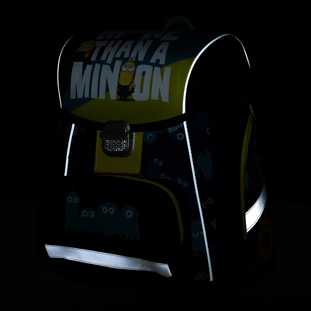 Školní aktovka z řady Premium s motivem Mimoňů je anatomicky tvarovaná a zajišťuje tak správné usazení na zádech. Vyztužená záda a vnitřní výztuha udržují stálý tvar batohu. Polstrování je z příjemného prodyšného materiálu, široké měkčené popruhy jsou navrženy tak, aby dokonale přilnuly a rovnoměrně zatížily ramena dítěte. Aktovka se skládá z jedné prostorné komory, kam se pohodlně vejdou všechny školní pomůcky pro děti v 1. a ve 2. třídě. Dno batohu je z pevného materiálu, chrání tím obsah před převržením a vysypáním. Zapínání je na bezpečnostní přezku. Přední kapsička je určena na svačinu, nechybí řada reflexních prvků, díky kterým je aktovka viditelnější.