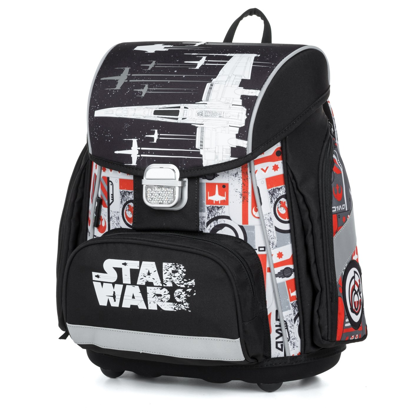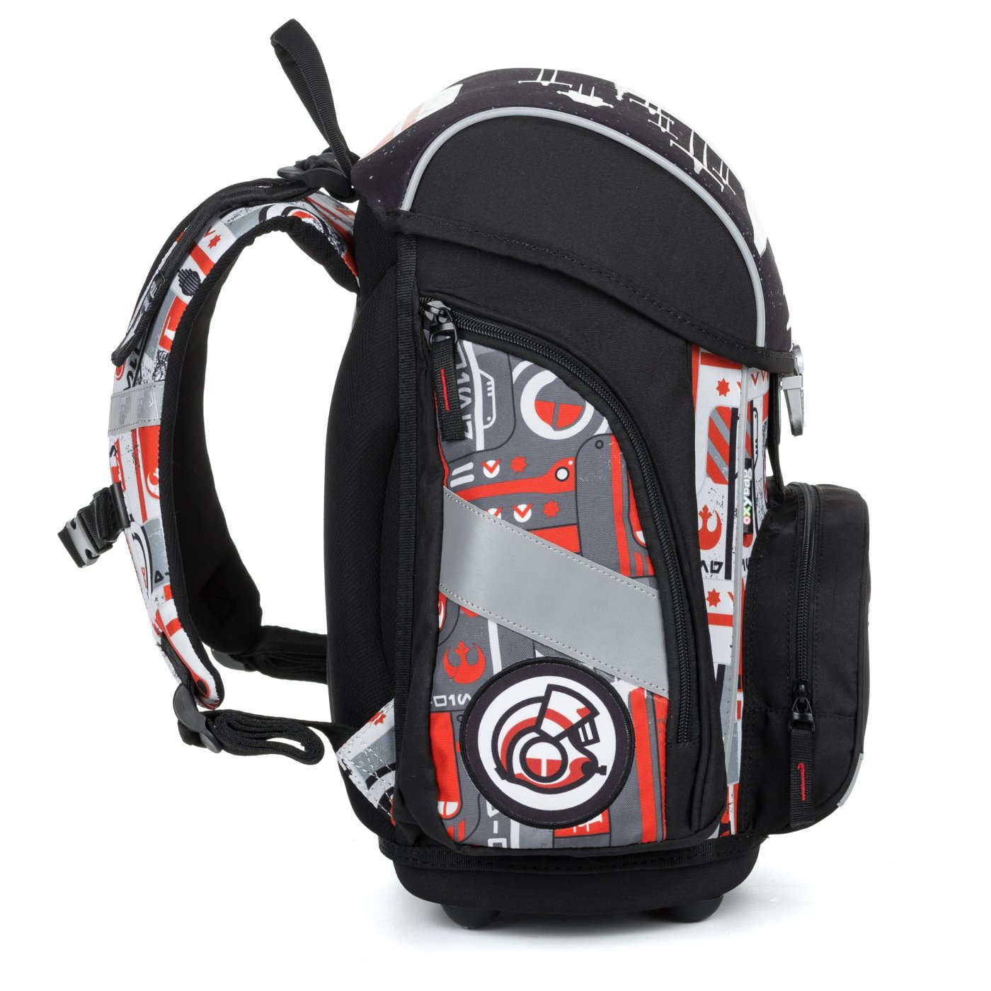 Školní aktovka z řady Premium s motivem Star Wars je anatomicky tvarovaná a zajišťuje tak správné usazení na zádech. Vyztužená záda a vnitřní výztuha udržují stálý tvar batohu. Polstrování je z příjemného prodyšného materiálu, široké měkčené popruhy jsou navrženy tak, aby dokonale přilnuly a rovnoměrně zatížily ramena dítěte. Aktovka se skládá z jedné prostorné komory, kam se pohodlně vejdou všechny školní pomůcky pro děti v 1. a ve 2. třídě. Dno batohu je z pevného materiálu, chrání tím obsah před převržením a vysypáním. Zapínání je na bezpečnostní přezku. Přední kapsička je určena na svačinu, nechybí řada reflexních prvků, díky kterým je aktovka viditelnější.