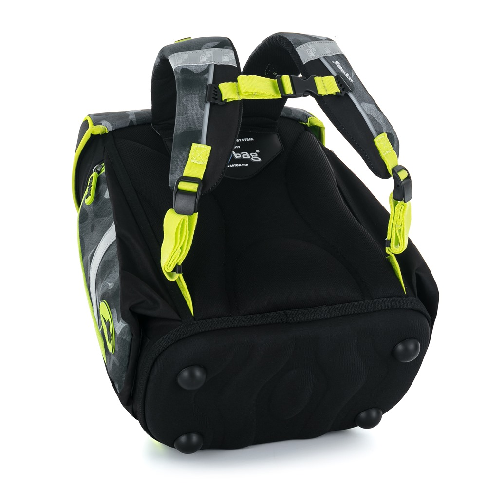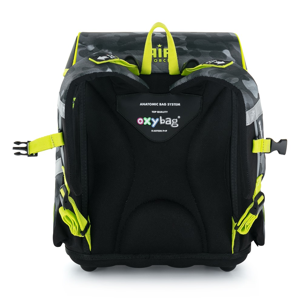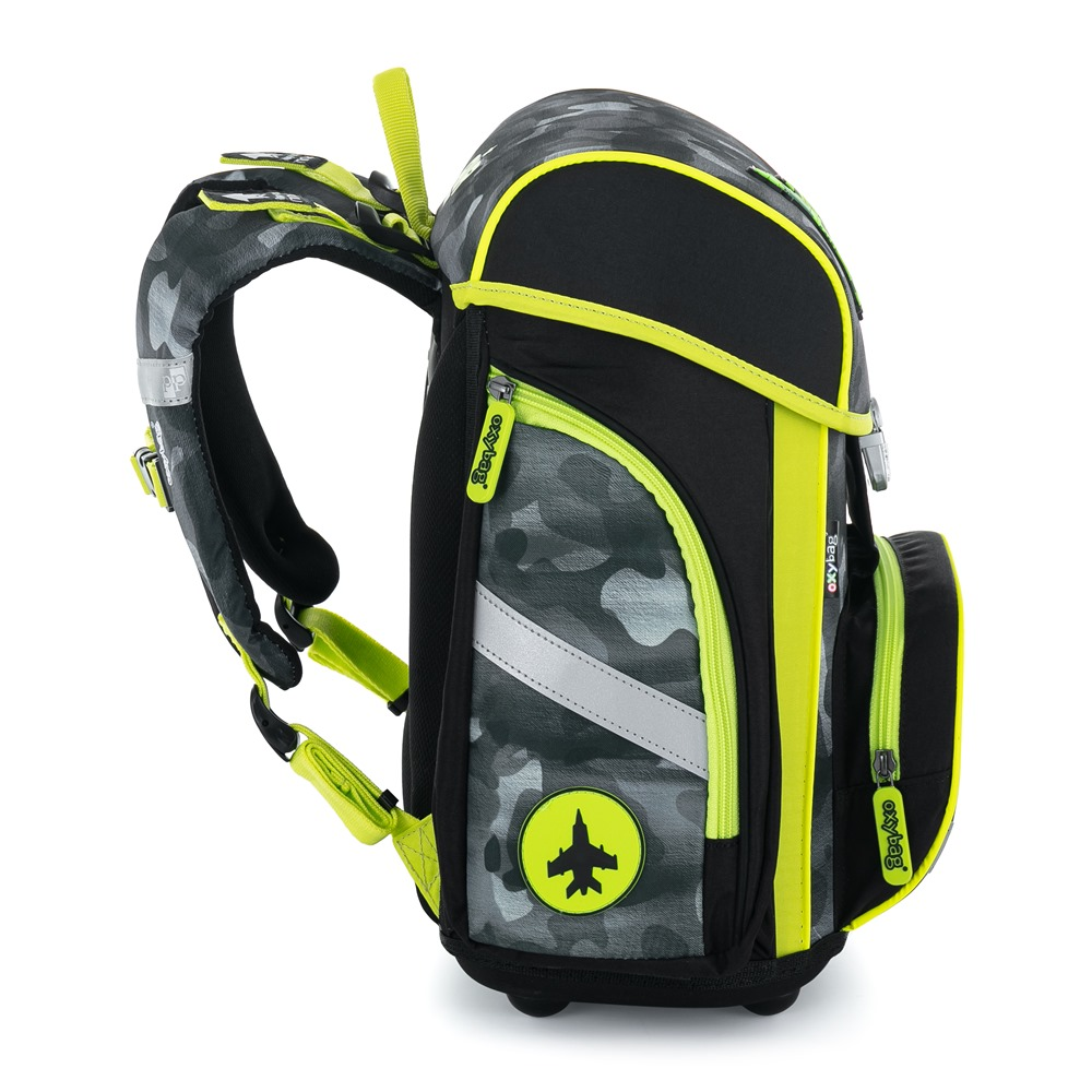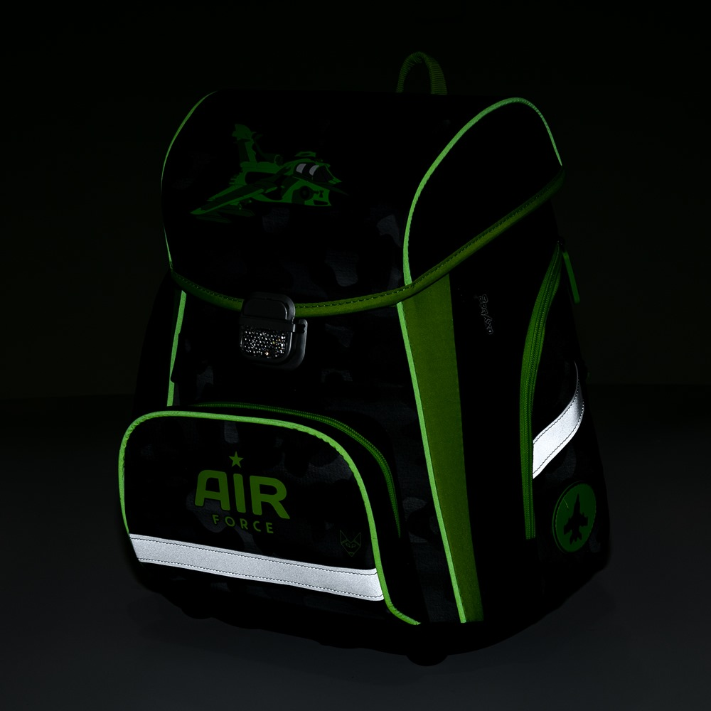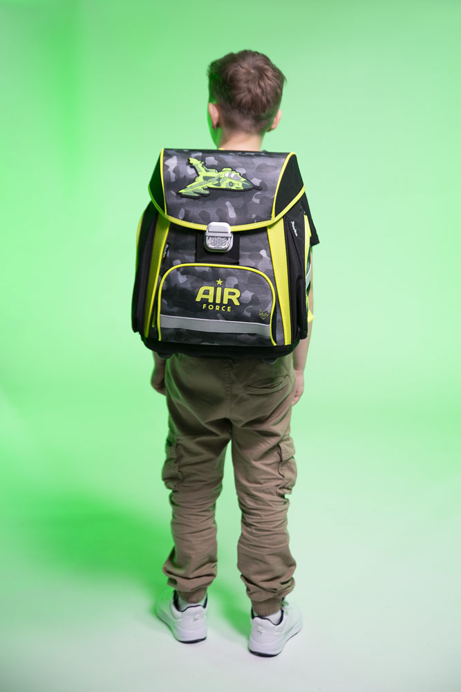 Školní aktovka z řady Premium s motivem stíhačky je anatomicky tvarovaná a zajišťuje tak správné usazení na zádech. Vyztužená záda a vnitřní výztuha udržují stálý tvar batohu. Polstrování je z příjemného prodyšného materiálu, široké měkčené popruhy jsou navrženy tak, aby dokonale přilnuly a rovnoměrně zatížily ramena dítěte. Aktovka se skládá z jedné prostorné komory, kam se pohodlně vejdou všechny školní pomůcky pro děti v 1. a ve 2. třídě. Dno batohu je z pevného materiálu, chrání tím obsah před převržením a vysypáním. Zapínání je na bezpečnostní přezku. Přední kapsička je určena na svačinu, nechybí řada reflexních prvků, díky kterým je aktovka viditelnější.