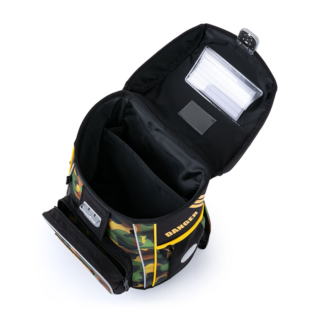 Školní aktovka z řady Premium s motivem army helikoptéry je anatomicky tvarovaná a zajišťuje tak správné usazení na zádech. Vyztužená záda a vnitřní výztuha udržují stálý tvar batohu. Polstrování je z příjemného prodyšného materiálu, široké měkčené popruhy jsou navrženy tak, aby dokonale přilnuly a rovnoměrně zatížily ramena dítěte. Aktovka se skládá z jedné prostorné komory, kam se pohodlně vejdou všechny školní pomůcky pro děti v 1. a ve 2. třídě. Dno batohu je z pevného materiálu, chrání tím obsah před převržením a vysypáním. Zapínání je na bezpečnostní přezku. Přední kapsička je určena na svačinu, nechybí řada reflexních prvků, díky kterým je aktovka viditelnější.
