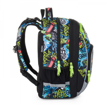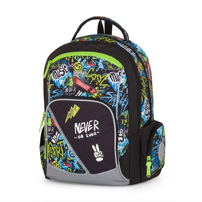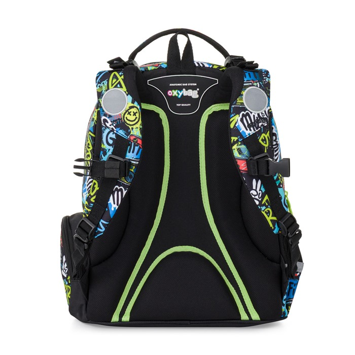Školní batoh OXY GO zaujme moderním designem a promyšlenou funkčností. Má anatomicky tvarovaná, prodyšná záda a nastavitelné ramenní popruhy pro pohodlné nošení. Přidané háčky umožňují uchycení dlouhých popruhů. Vnitřní kapsy nabízí dostatek místa na učebnice, sešity i další potřeby, pevné nepromokavé dno chrání obsah před ušpiněním a protečením. Boční kapsy, jedna na zip a jedna otevřená, slouží např. na láhev. Reflexní prvky zajišťují bezpečnost. Batoh je ideální pro děti od 1. do 3. třídy vysoké od 125 cm. Délka zádového panelu je 39 cm, objem 22 l, hmotnost 930 g, nosnost 8 kg. Sáček: Praktický na cvičky nebo volnočasové aktivity, uzavírá se šňůrkami. Penál: Jednopatrový se dvěma chlopněmi, poutka na psací potřeby a průhledná fólie na rozvrh hodin.