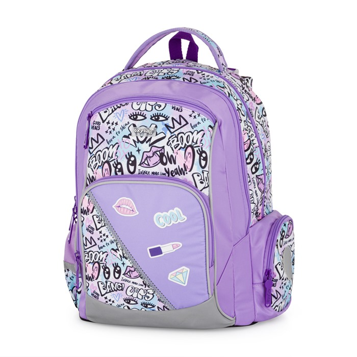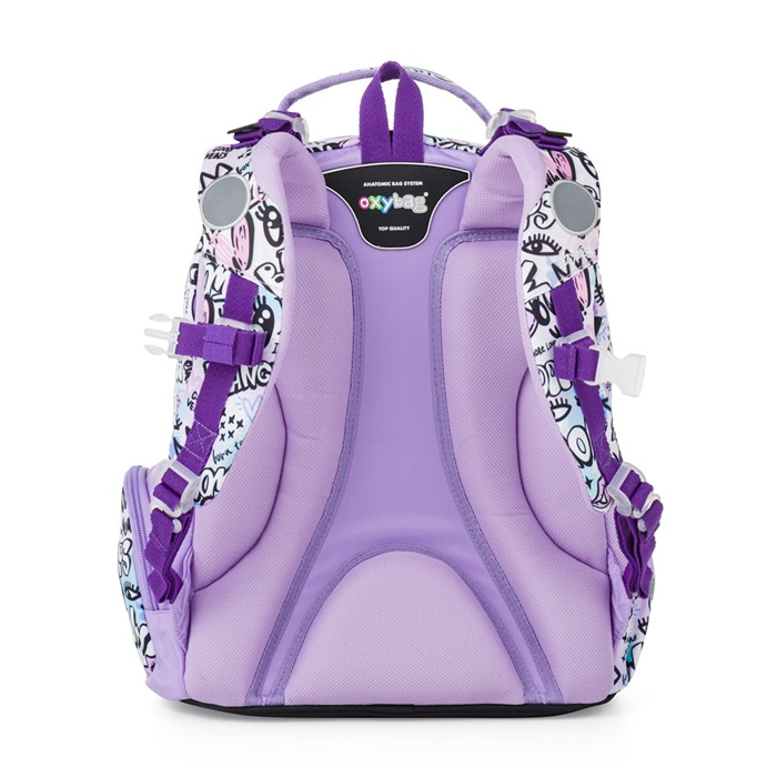 Školní batoh OXY GO zaujme moderním designem a promyšlenou funkčností. Má anatomicky tvarovaná, prodyšná záda a nastavitelné ramenní popruhy pro pohodlné nošení. Přidané háčky umožňují uchycení dlouhých popruhů. Vnitřní kapsy nabízí dostatek místa na učebnice, sešity i další potřeby, pevné nepromokavé dno chrání obsah před ušpiněním a protečením. Boční kapsy, jedna na zip a jedna otevřená, slouží např. na láhev. Reflexní prvky zajišťují bezpečnost. Batoh je ideální pro děti od 1. do 3. třídy vysoké od 125 cm. Délka zádového panelu je 39 cm, objem 22 l, hmotnost 930 g, nosnost 8 kg. Sáček: Praktický na cvičky nebo volnočasové aktivity, uzavírá se šňůrkami. Penál: Jednopatrový se dvěma chlopněmi, poutka na psací potřeby a průhledná fólie na rozvrh hodin.