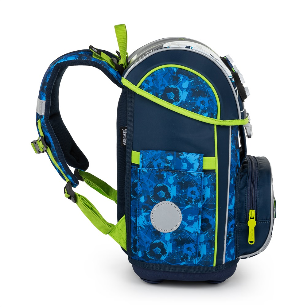 Aktovka: Školní aktovka z řady Premium je anatomicky tvarovaná a zajišťuje tak správné usazení na zádech. Vyztužená záda a vnitřní výztuha udržují stálý tvar batohu. Polstrování je z příjemného prodyšného materiálu, široké měkčené popruhy jsou navrženy tak, aby dokonale přilnuly a rovnoměrně zatížily ramena dítěte. Aktovka se skládá z jedné prostorné komory, kam se pohodlně vejdou všechny školní pomůcky pro děti v 1. a ve 2. třídě. Dno batohu je z pevného materiálu, chrání tím obsah před převržením a vysypáním. Zapínání je na bezpečnostní kovovou přezku s reflexní odrazkou. Přední kapsička je určena na svačinu, nechybí řada reflexních prvků, díky kterým je aktovka viditelnější. Délka zádového panelu: 33 cm. Objem: 27 l. Nosnost: 8 kg. Sáček: Praktický sáček na cvičky nebo přezůvky do školy. Uzavírá se snadno stažením šňůrek. Penál: Jednopatrový školní penál se dvěma chlopněmi bez náplně. Gumová poutka k uchycení psacích potřeb. Na vnitřní chlopni je průhledná fólie na rozvrh hodin.