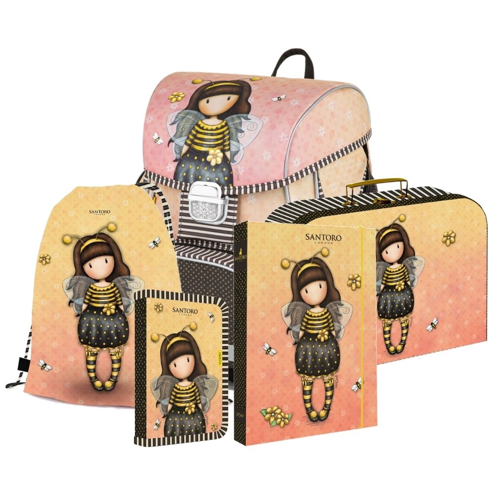 Školní set pro prvňáčka s motivem Santoro Bee-loved. Set obsahuje školní batoh Premium, sáček na cvičky, prázdný jednopatrový penál, kufřík a box na sešity A4.