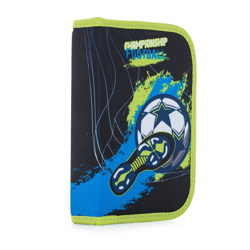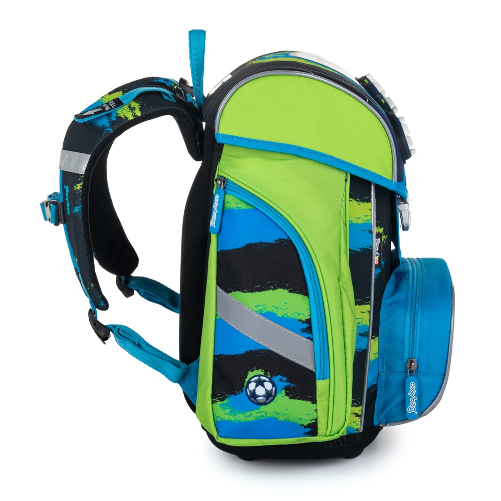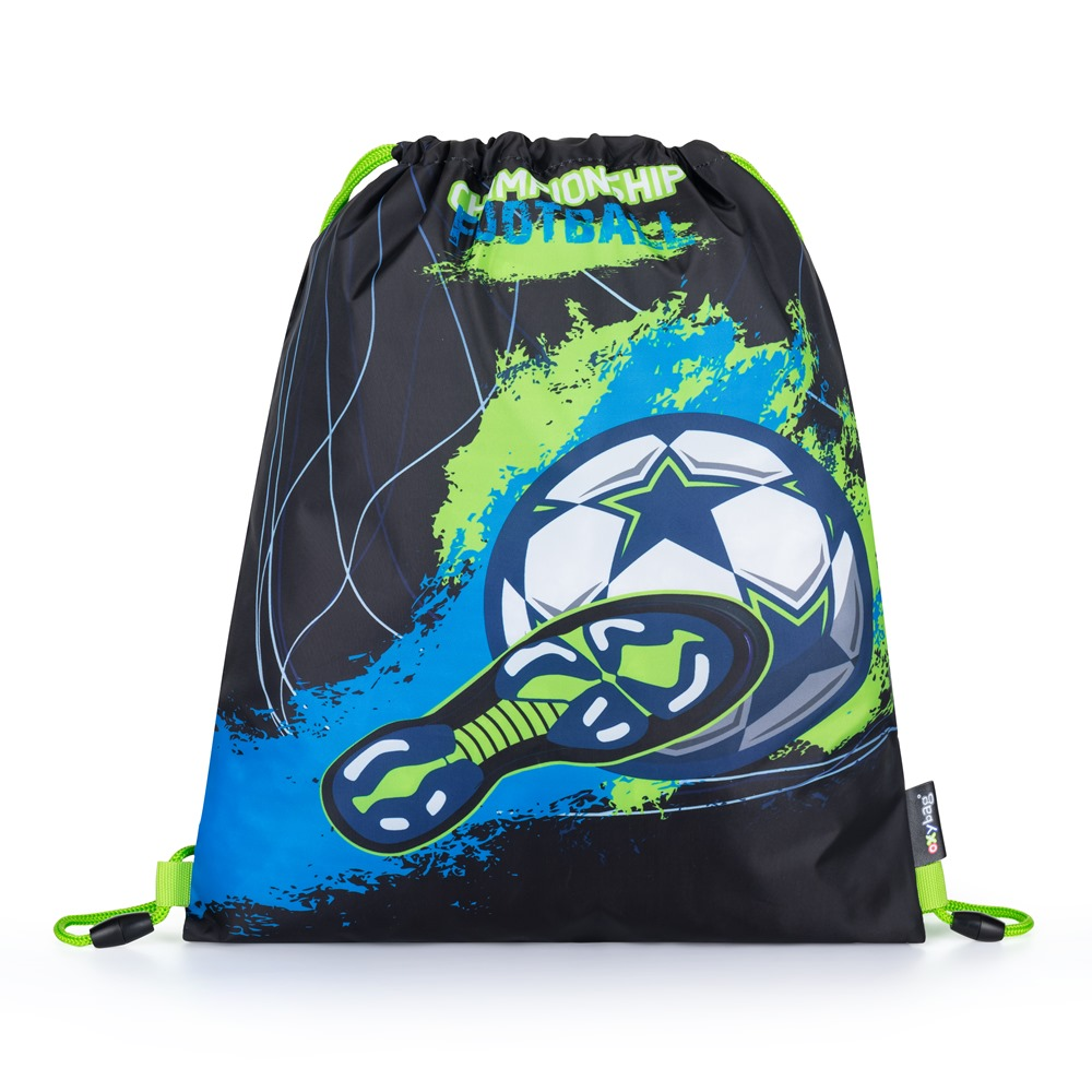 Školní set pro prvňáčka s motivem fotbalu. Set obsahuje školní batoh Premium, sáček na cvičky, prázdný jednopatrový penál, kufřík a box na sešity A4.